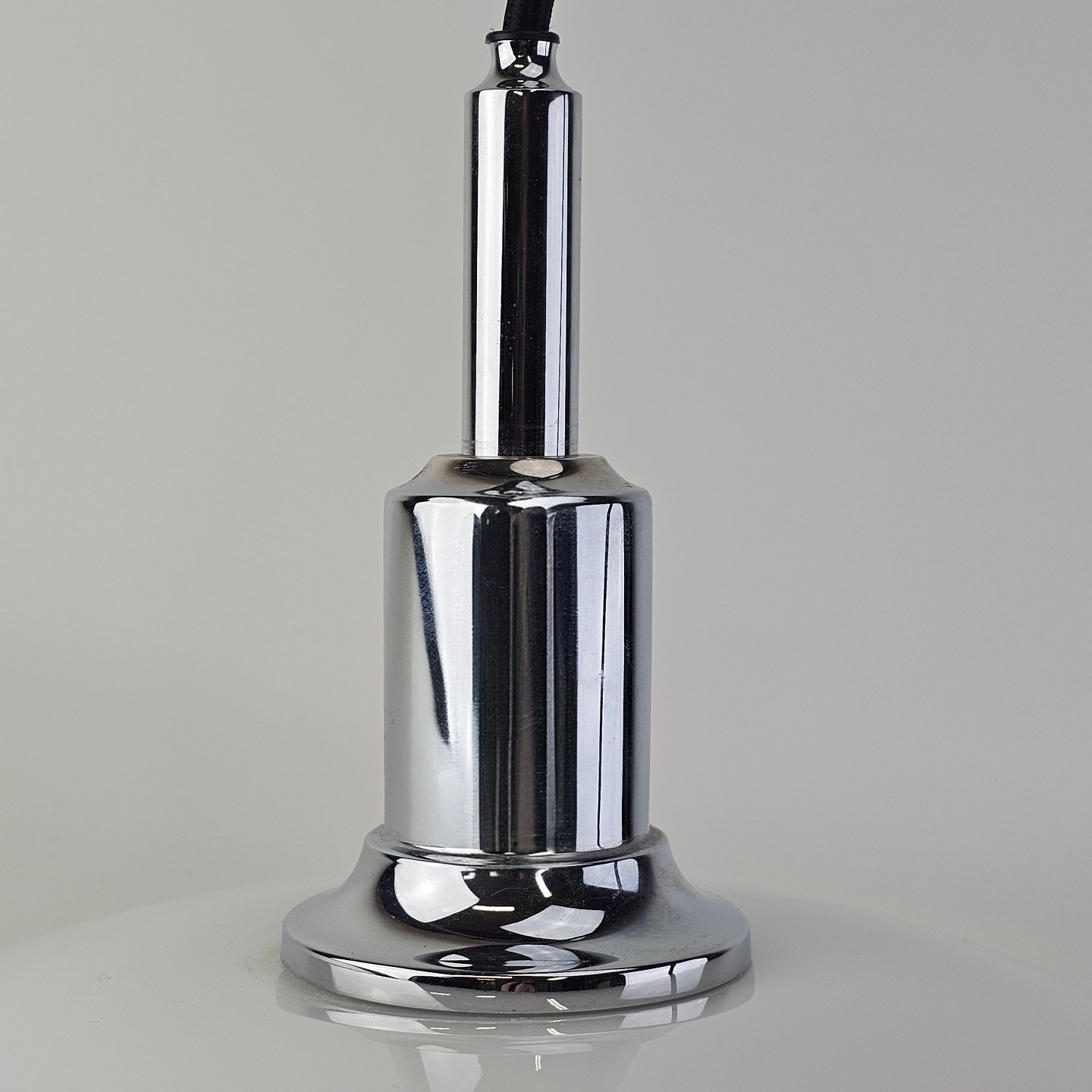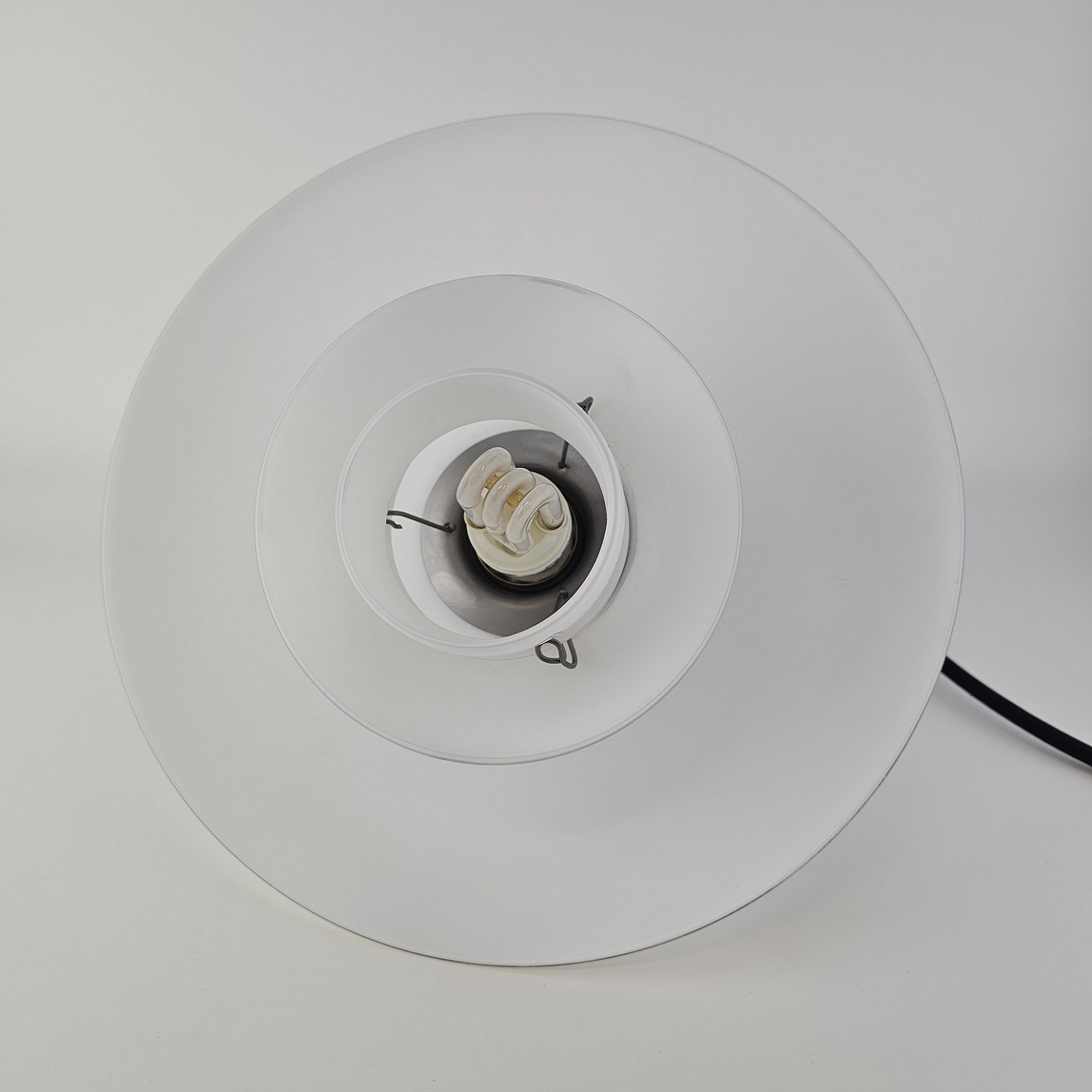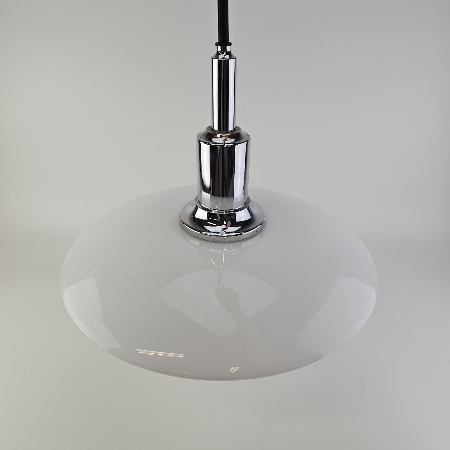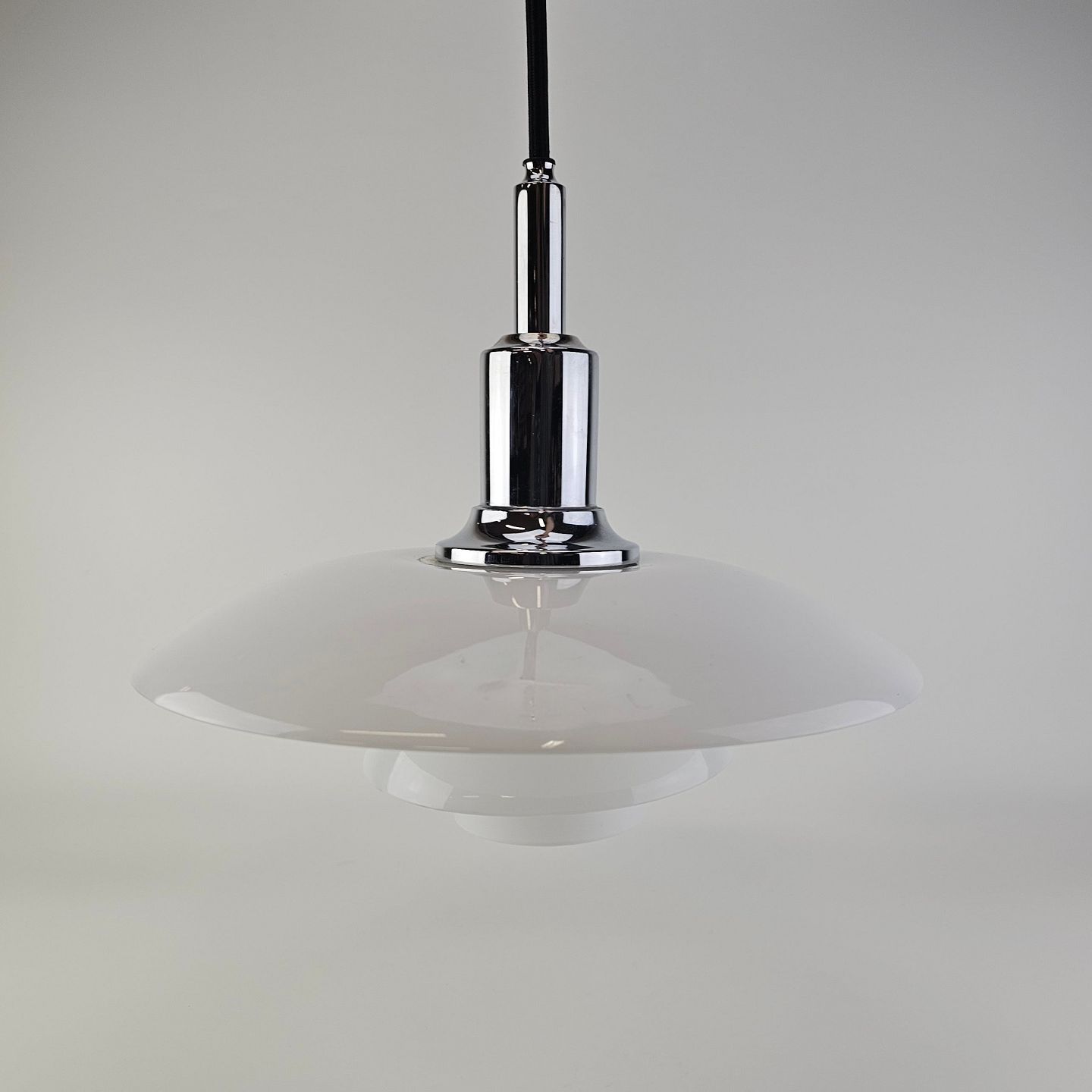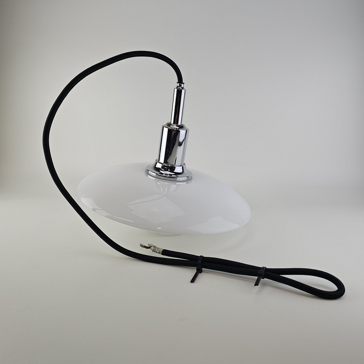 Loftlampe i hvidt opal glas med fatning i forkromet metal