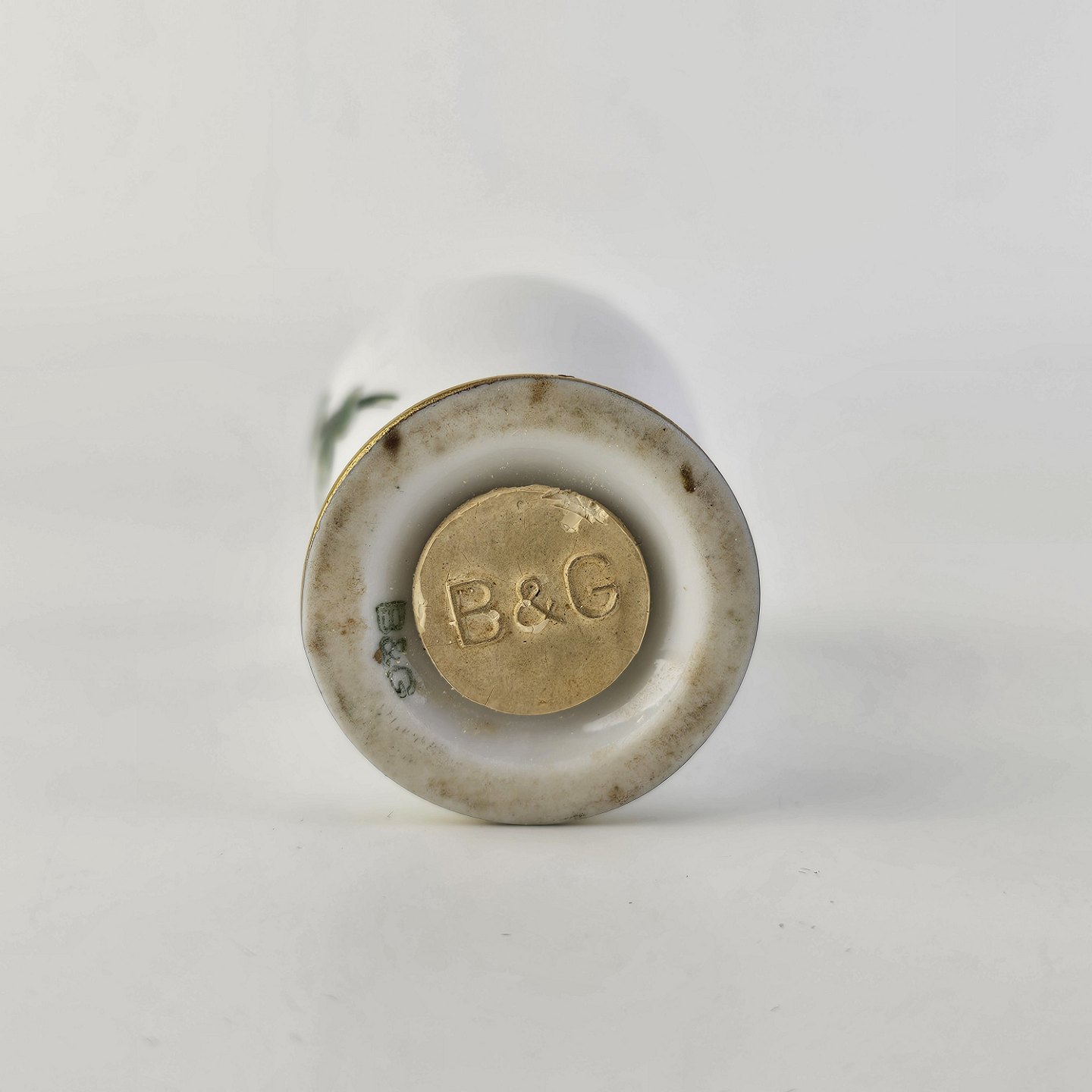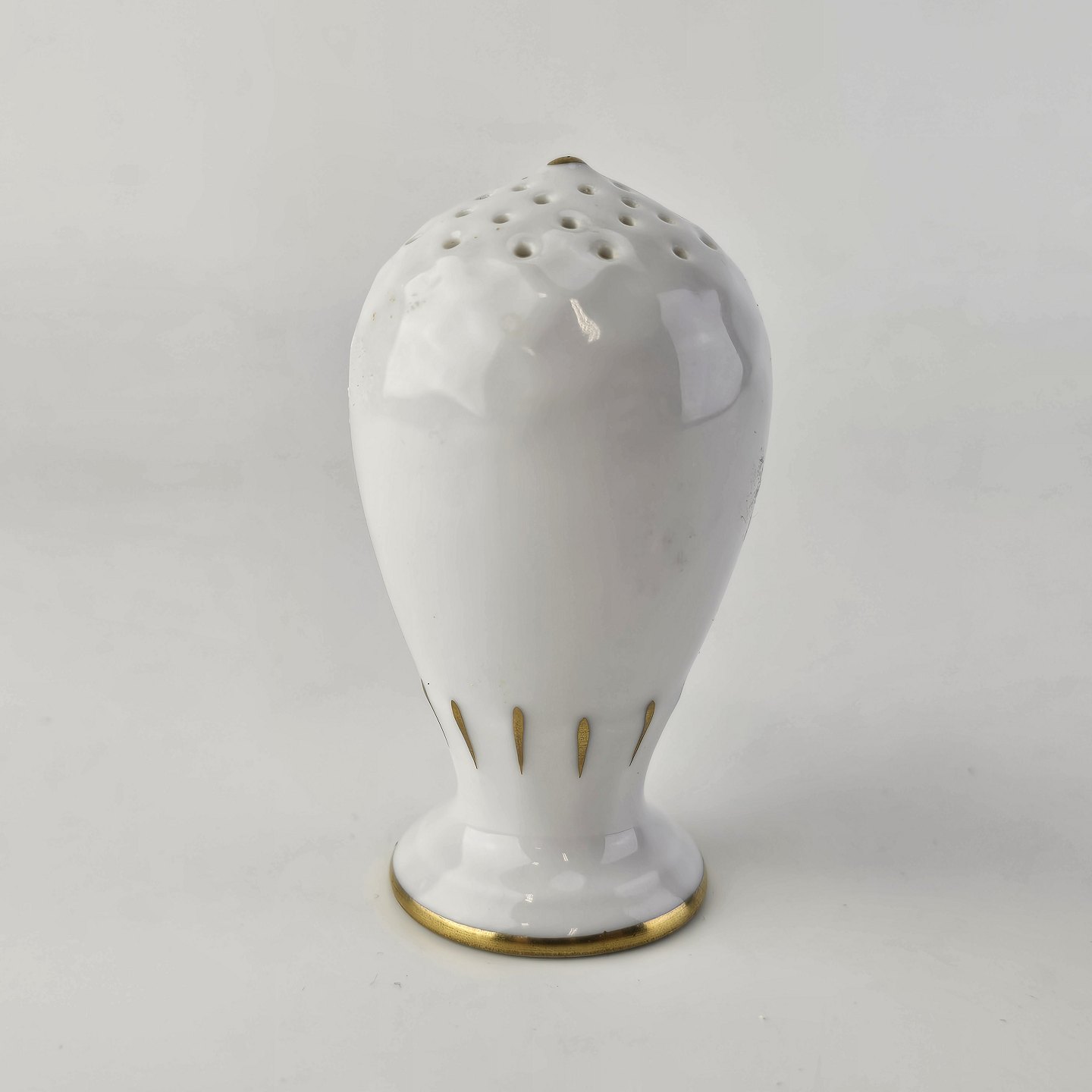 Krysantemum er hvidt porcelæn dekoreret med lys lilla blomst, grønne blade og guldkant.