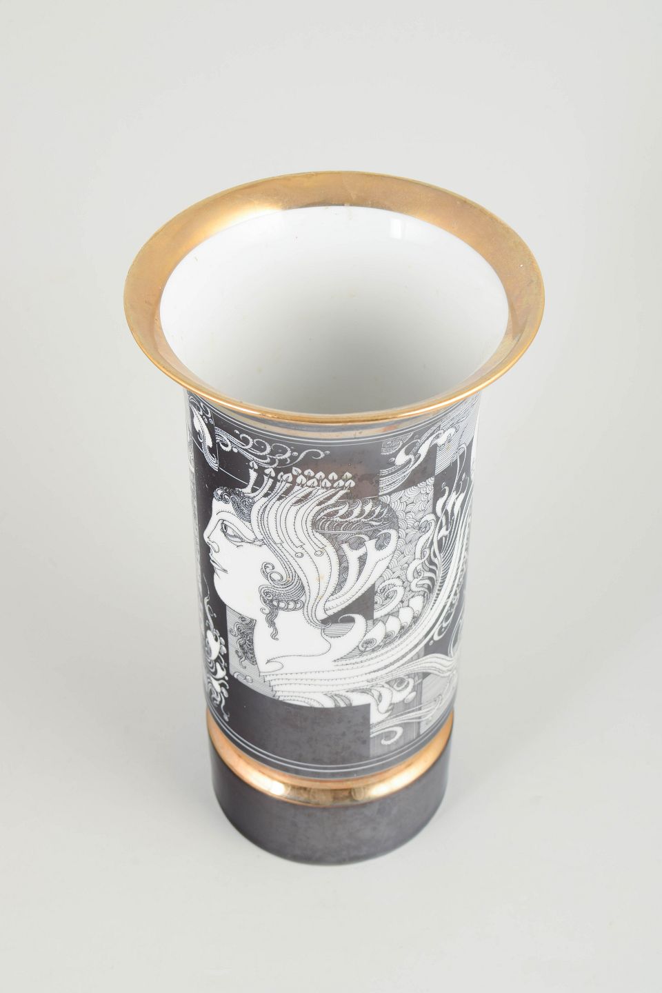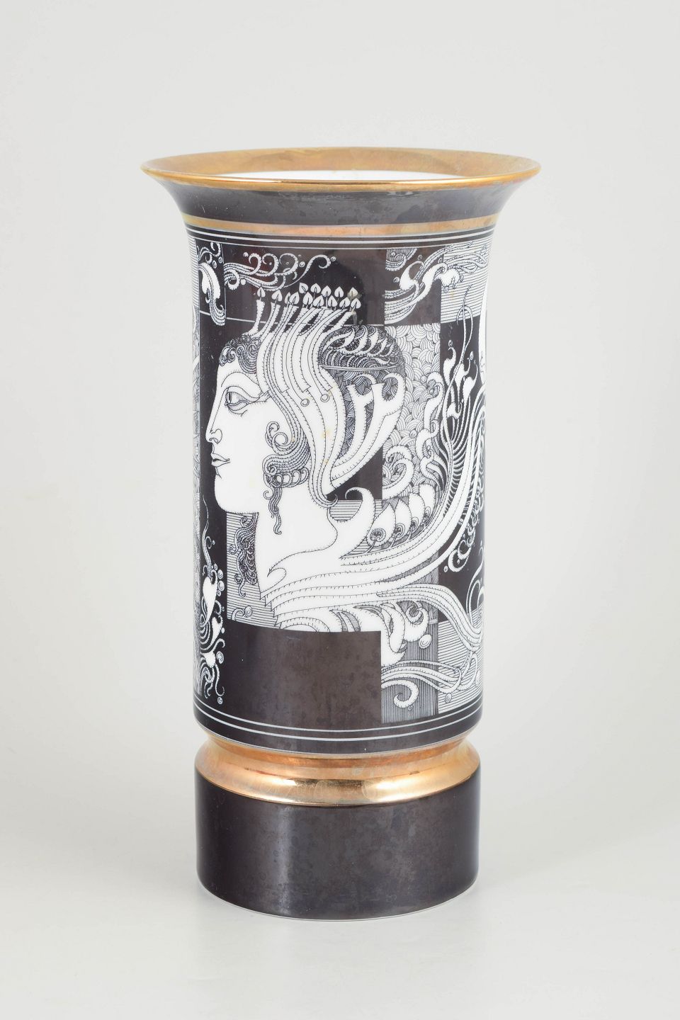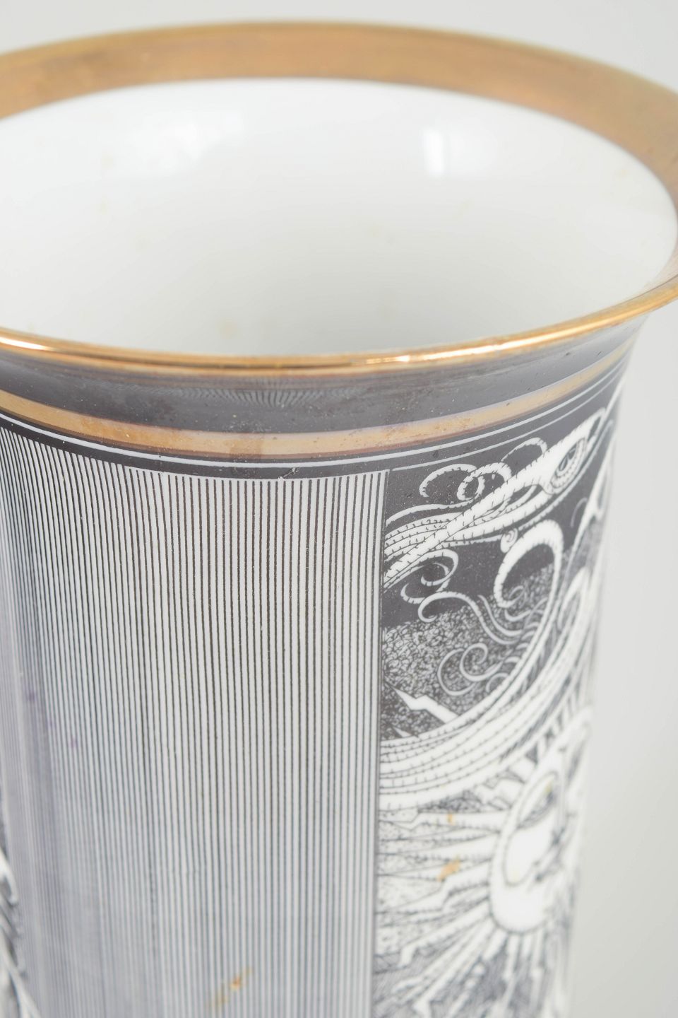 Stor cylindrisk vase i porcelæn med sort og hvid grafisk dekoration samt gulddetaljer. Fremstillet i begrænset udgave.