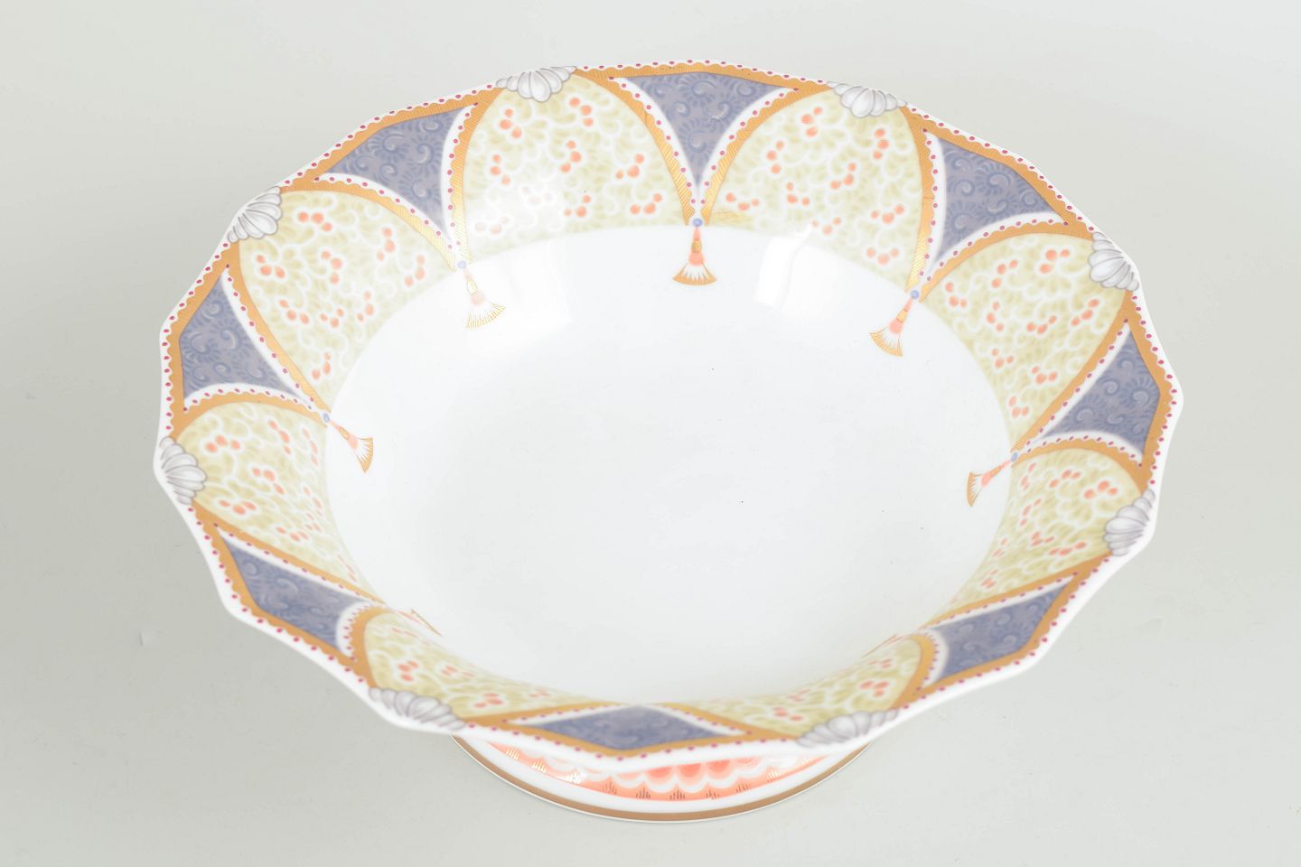 Stor opsats i hvidt porcelæn med fod, dekoreret med Fairytale-mønster i bløde rosa, gyldne og blå toner langs kanten. Fremstillet i perioden 1992–1999 i 1. sortering. Model 577.