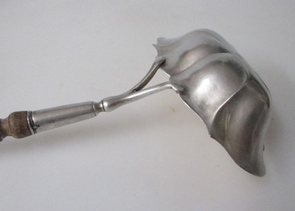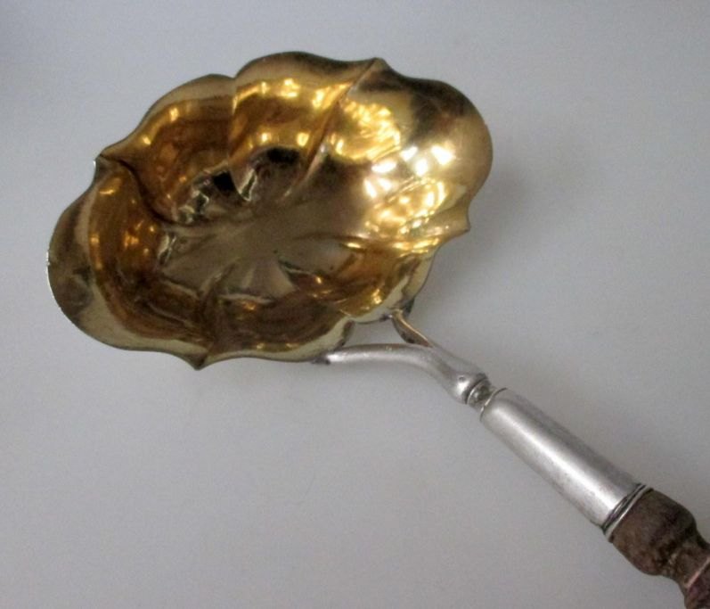 Sølv barok punche ske, 18. Årh. Danmark. Skævknækket rococo. Indvendig lueforgyldt. Utydelig stemplet. Med håndtag i træ. Længde.: 43,5 cm. Med indgravering: N. Th. S - C.H.S 1804 - rester af tidligere graveringer.