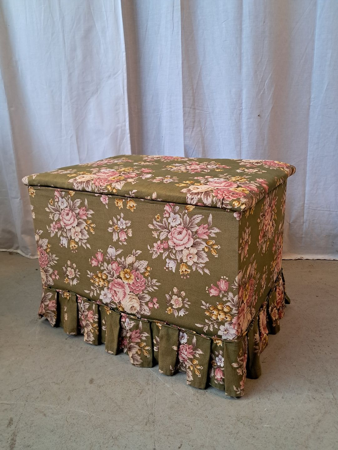 Puf i massivt fyrretræ med stof beklædning, fra 1940erne.
