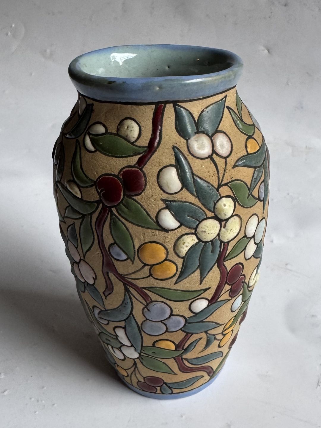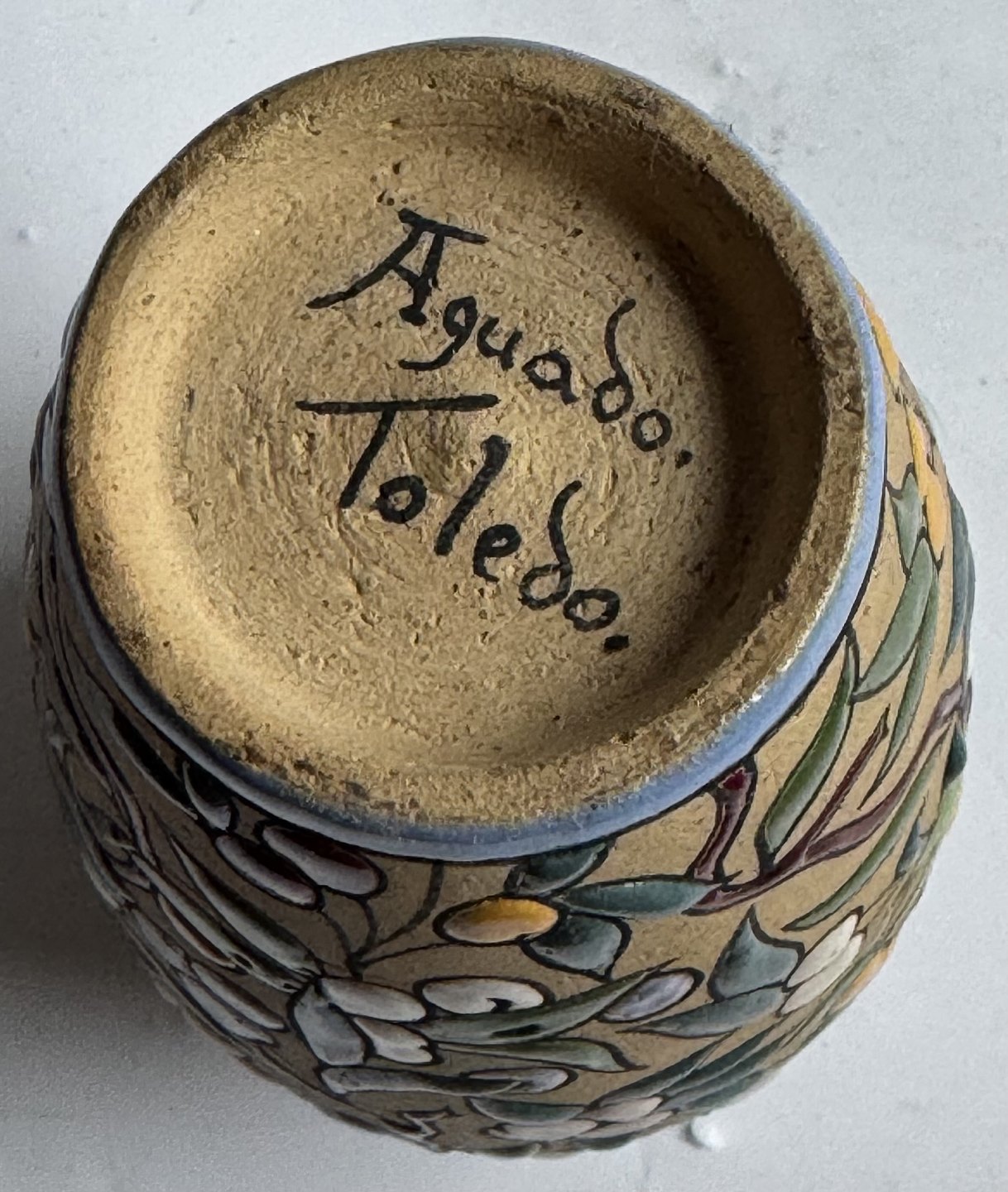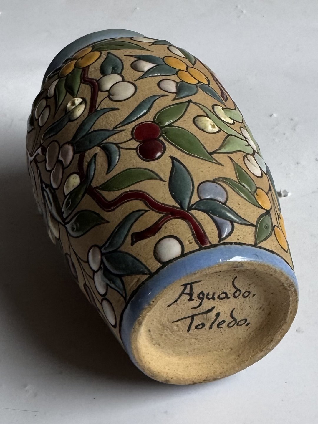 Arguado Toledo vase i keramik med farverig emalje blad og bær dekoration rundt om vasen. Grundlæggeren af dette produkt José Aguado Villalba (1919-2007) havde en mangeårig produktion af keramik i lignende stil fra midten af 1960’erne til i slutningen af 1980’erne i Toledo i Spanien. Vasen er 10,7 cm høj.