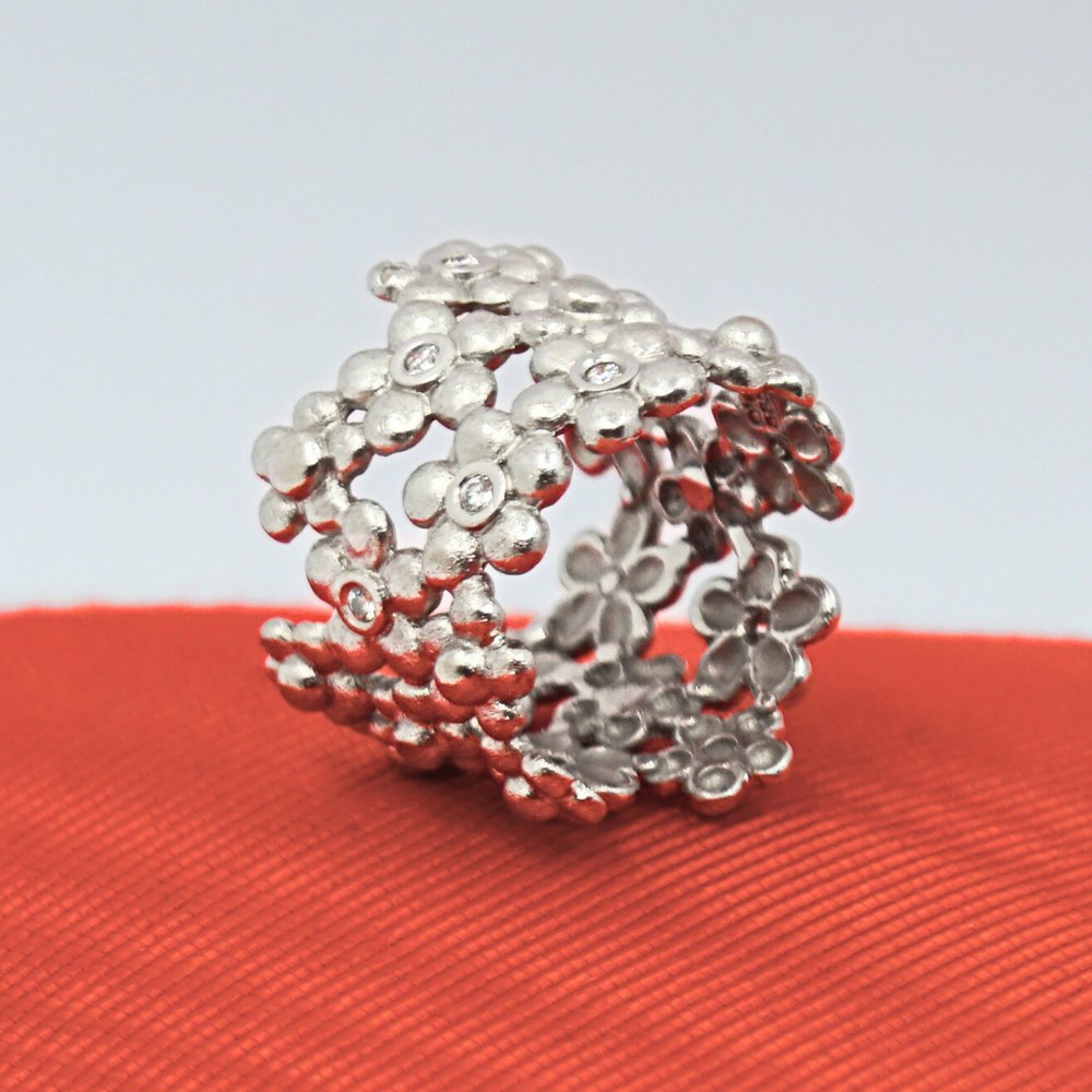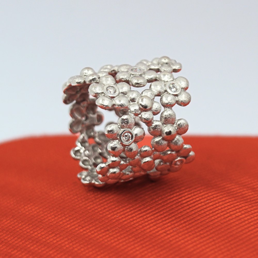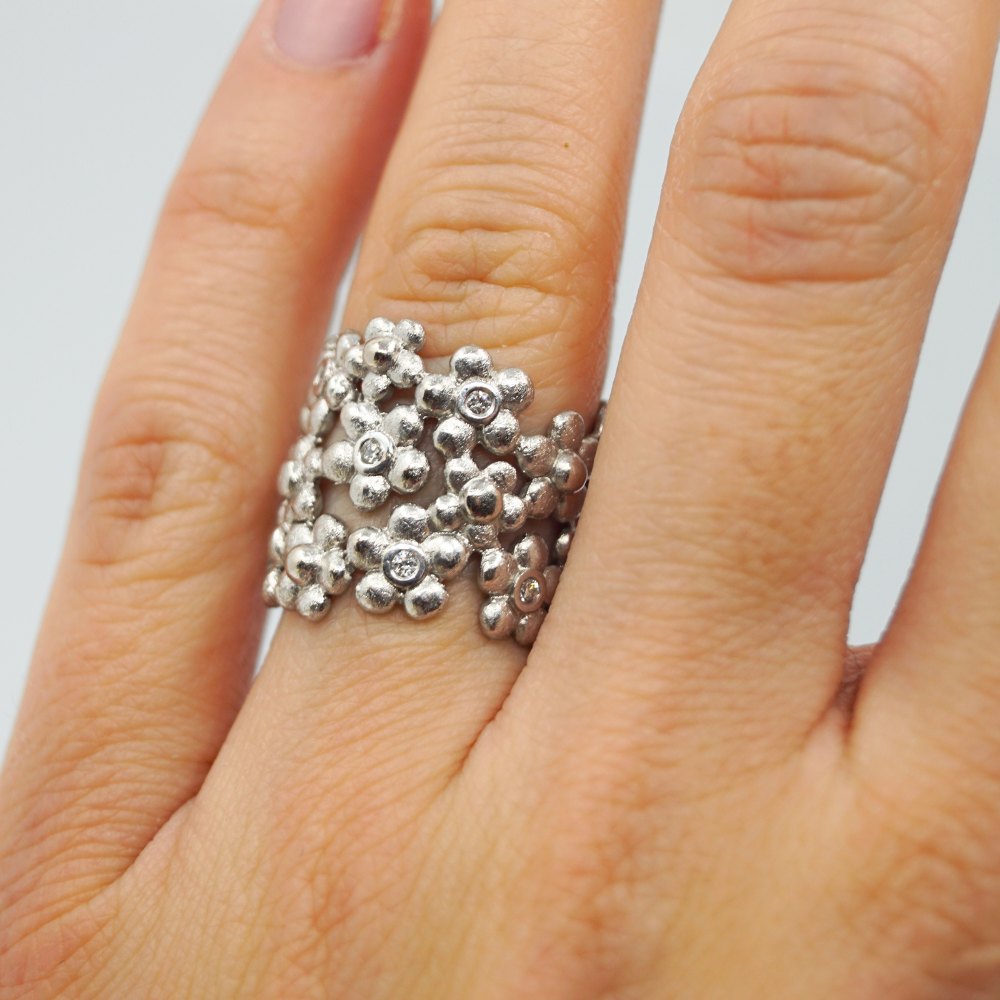 Ole Lynggaard hyldeblomstring af 14 kt. hvidguld. Prydet med 12 diamant, i alt 0.18 ct. W. VS.