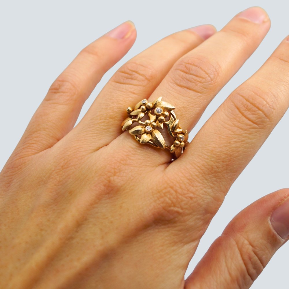 Charlotte Lynggaard for Ole Lynggaard; Spring ring af 18 kt. guld, prydet med fem diamanter, i alt 0,06 ct. TW VS.