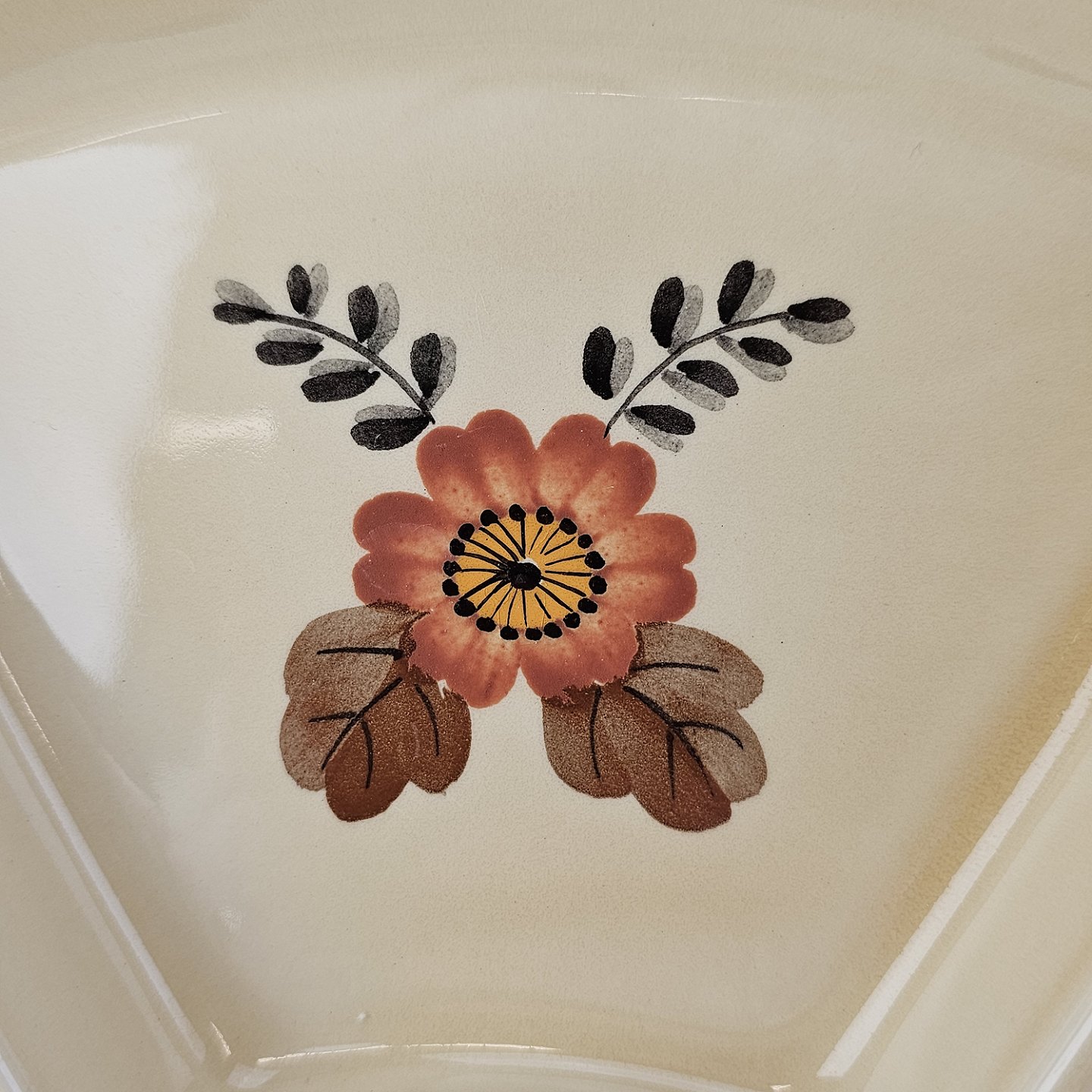 Knud er cremefarvet fajance dekoreret med flettet kant og brune og orange blomster. Stellet blev produceret i år 1934-1963.