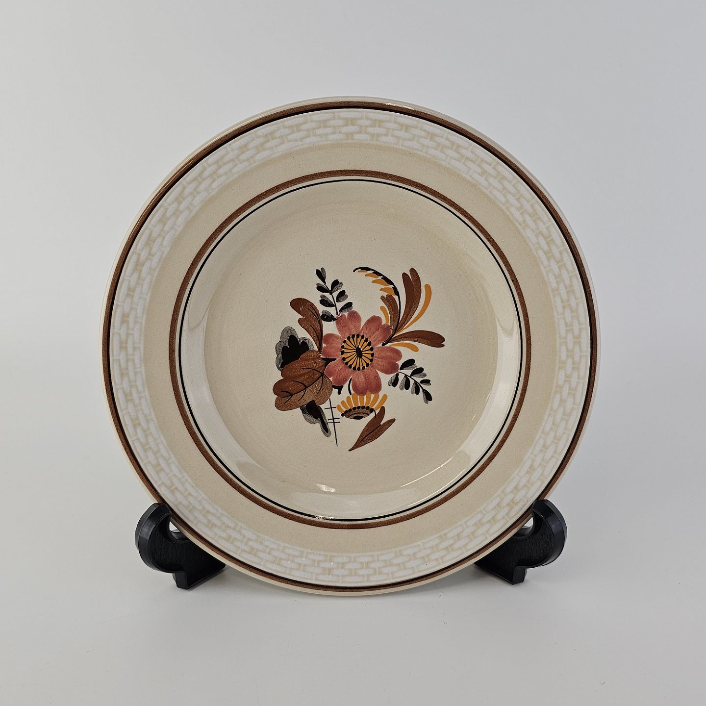 Knud er cremefarvet fajance dekoreret med flettet kant og brune og orange blomster. Stellet blev produceret i år 1934-1963.