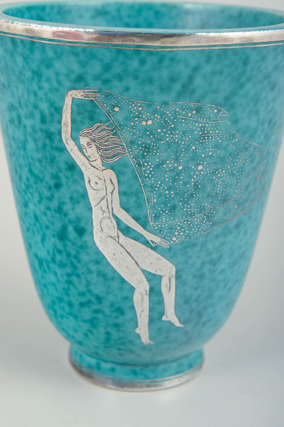 Turkisglaseret stentøjsvase fra Argenta-serien med indlagt sølvdekoration i form af figurmotiv. Model 978.