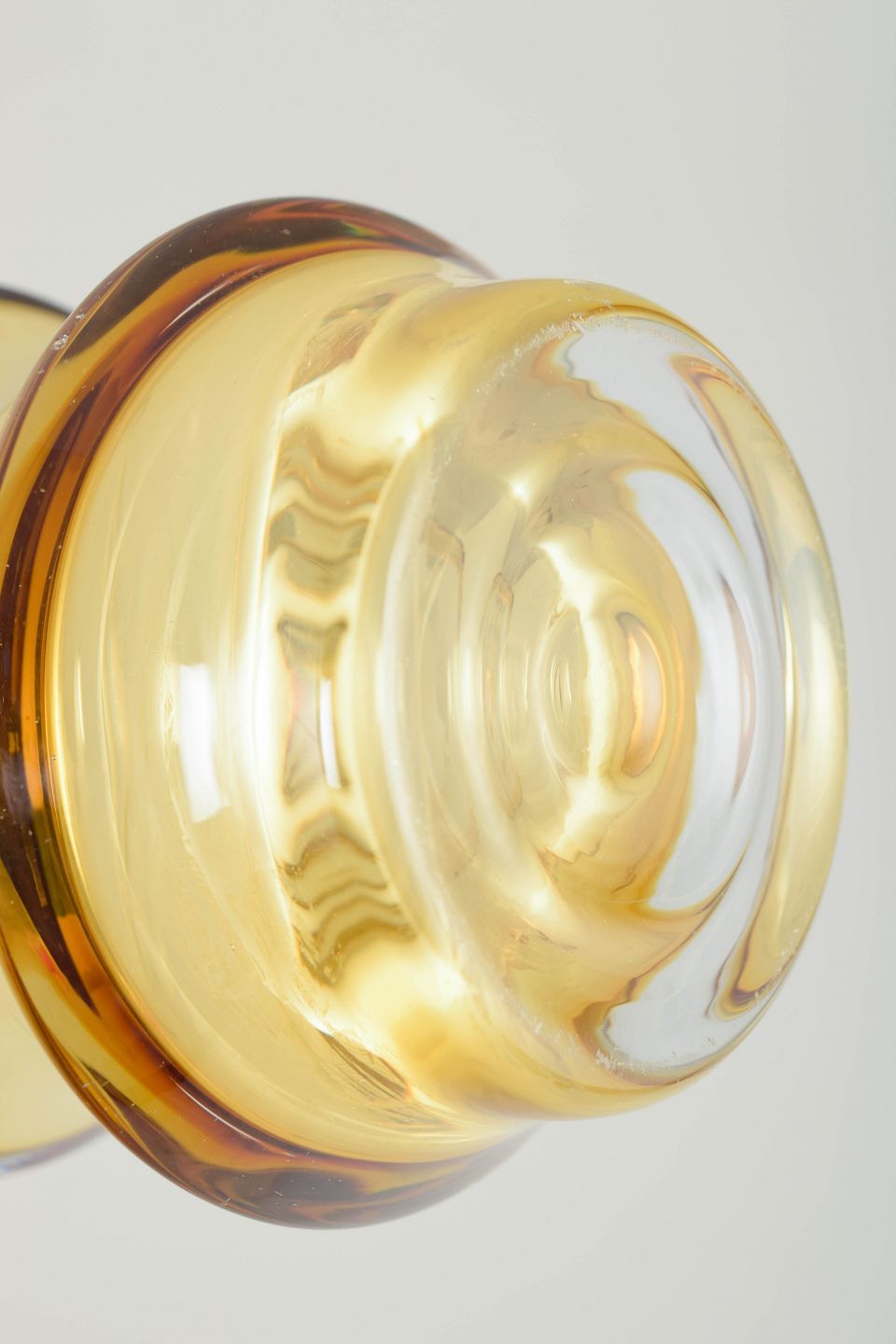 Høj cylindrisk vase i ravfarvet kunstglas med let udadbøjet munding og markant profileret fod. Udført i mundblæst glas med varm gylden tone og klar, massiv sokkel. Usigneret.