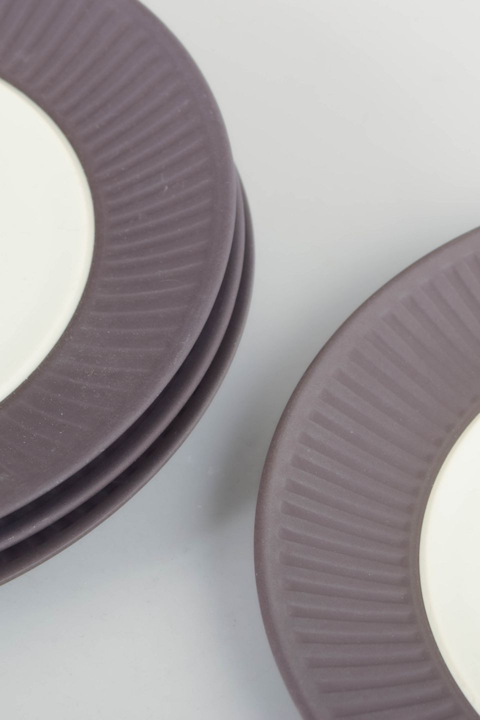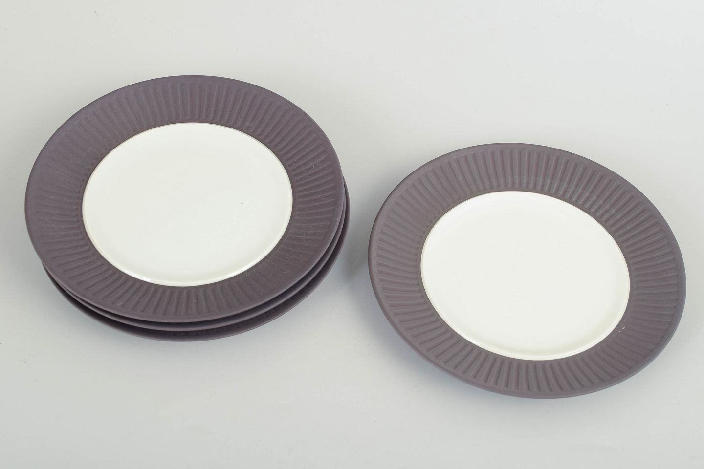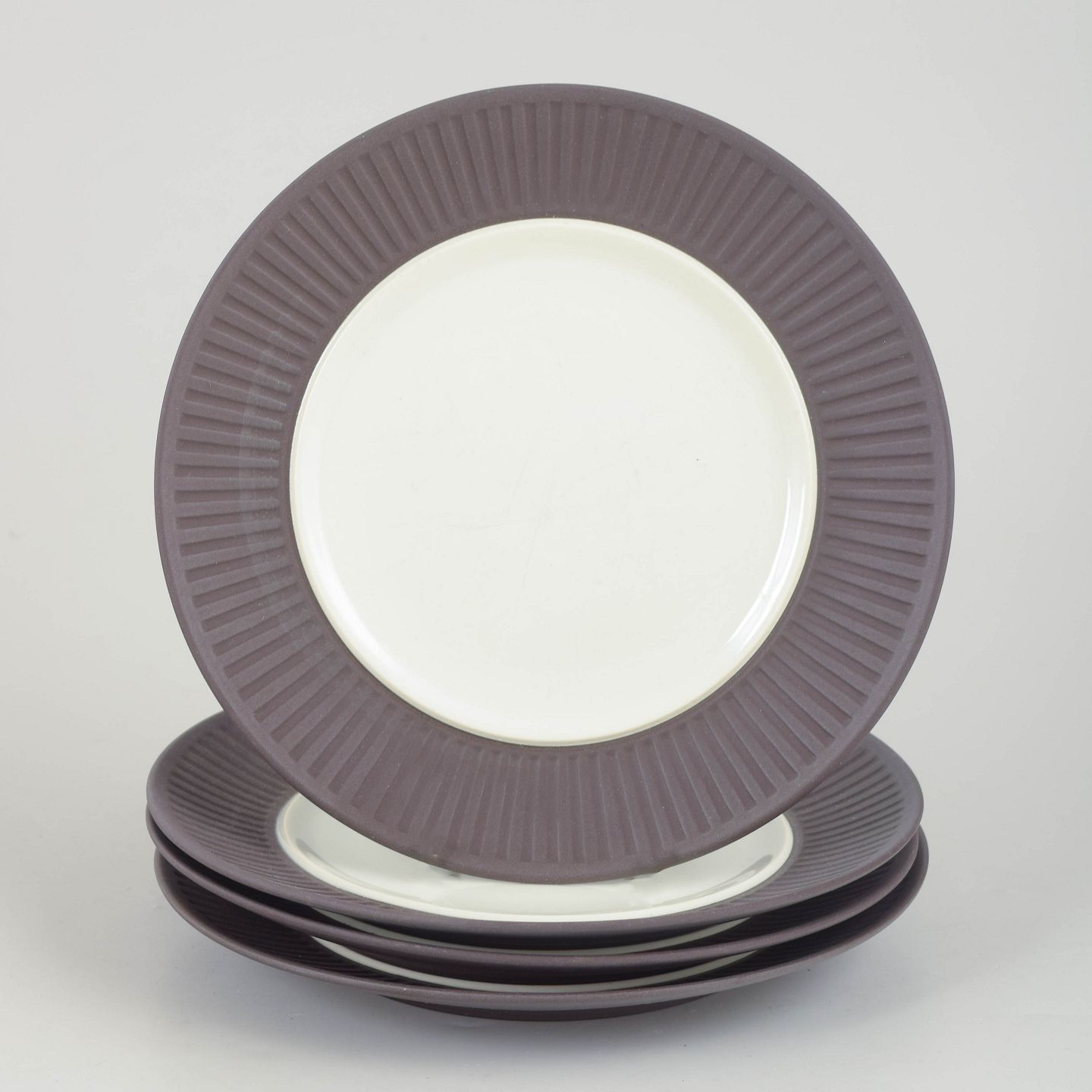 Sæt bestående af fire tallerkener i stentøj med hvid glasur og rillet fane samt lys glasur i spejlet.