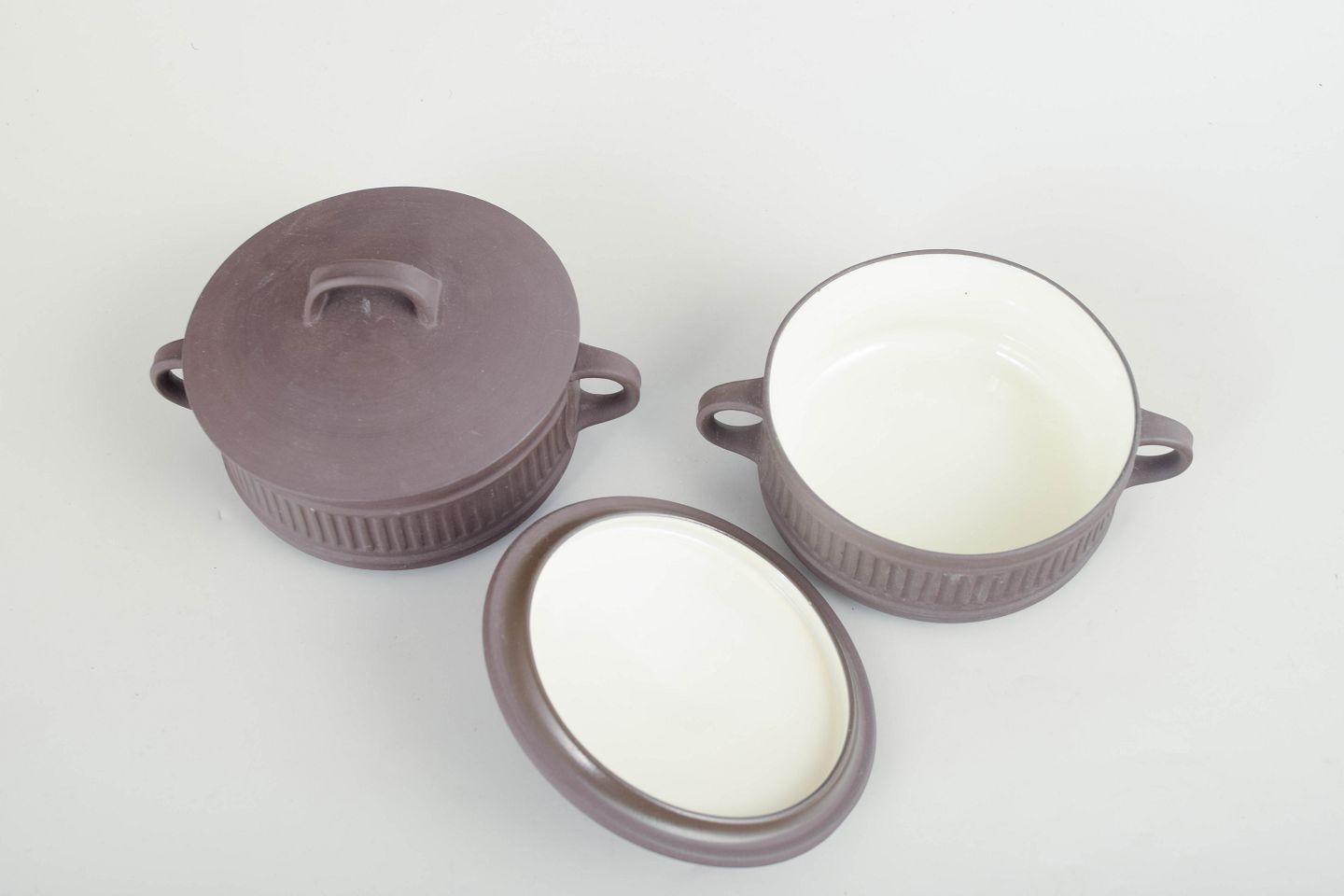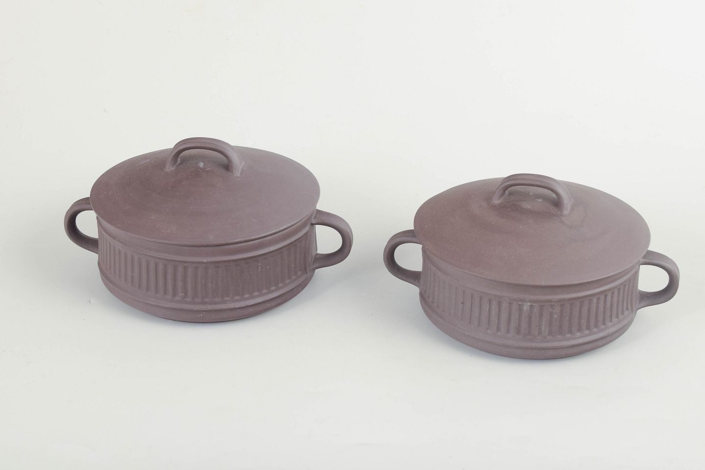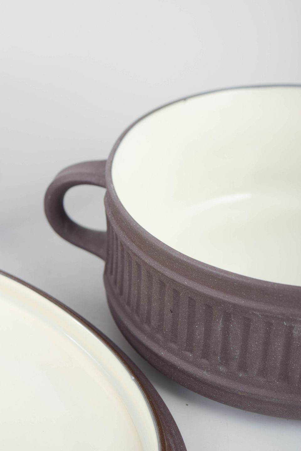 To bouillonkopper i stentøj med låg og sidehanke, udført i hvid glasur med rillet dekoration.
