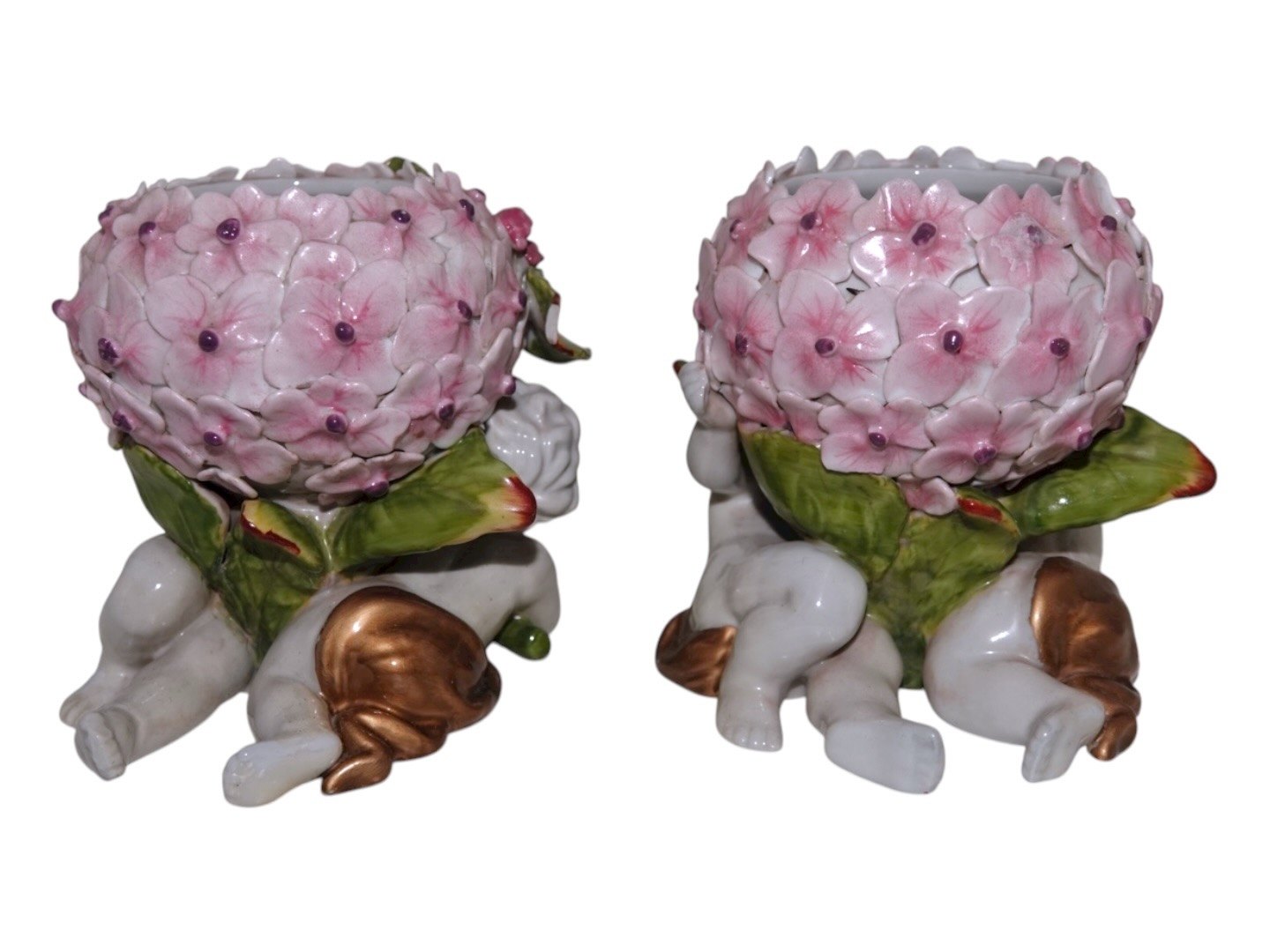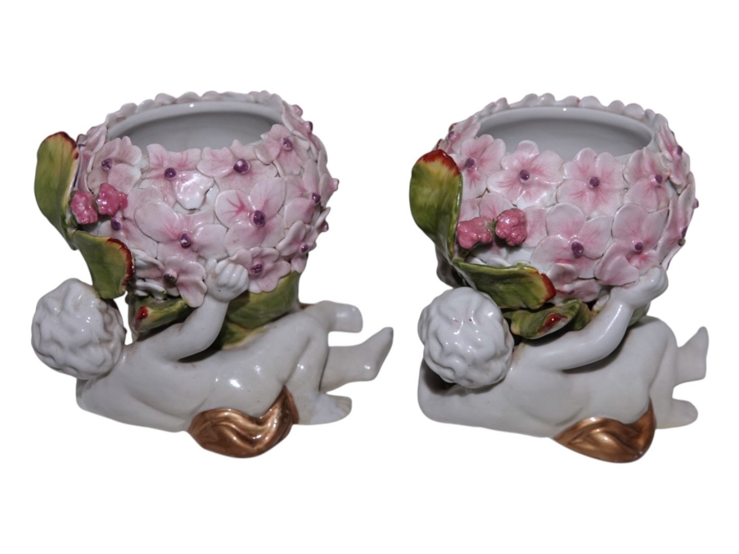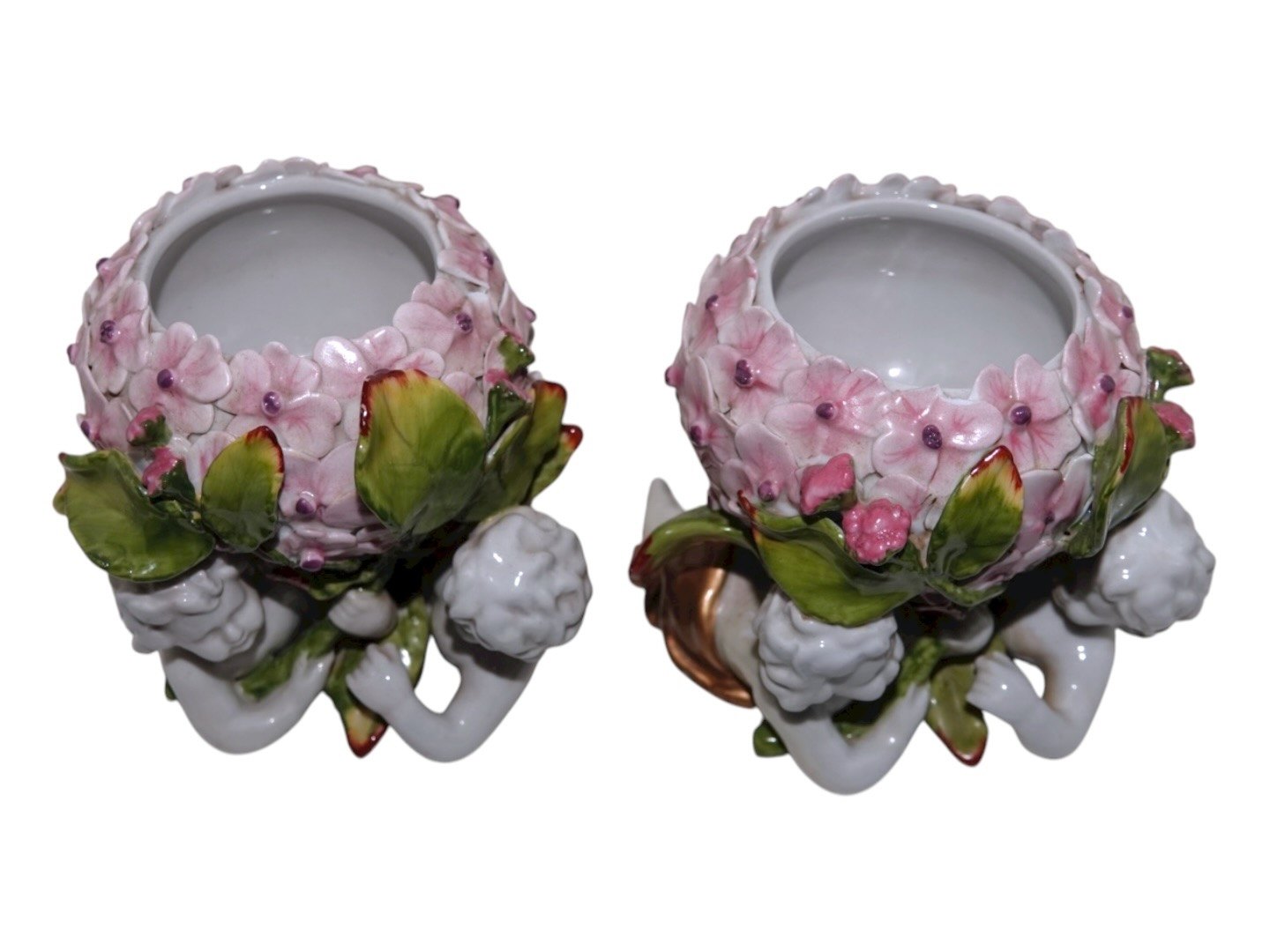To små urtepotteskjulere i porcelæn med hortensia og engle.