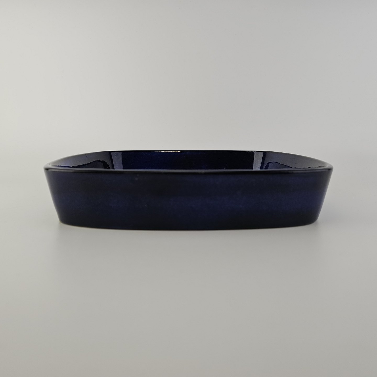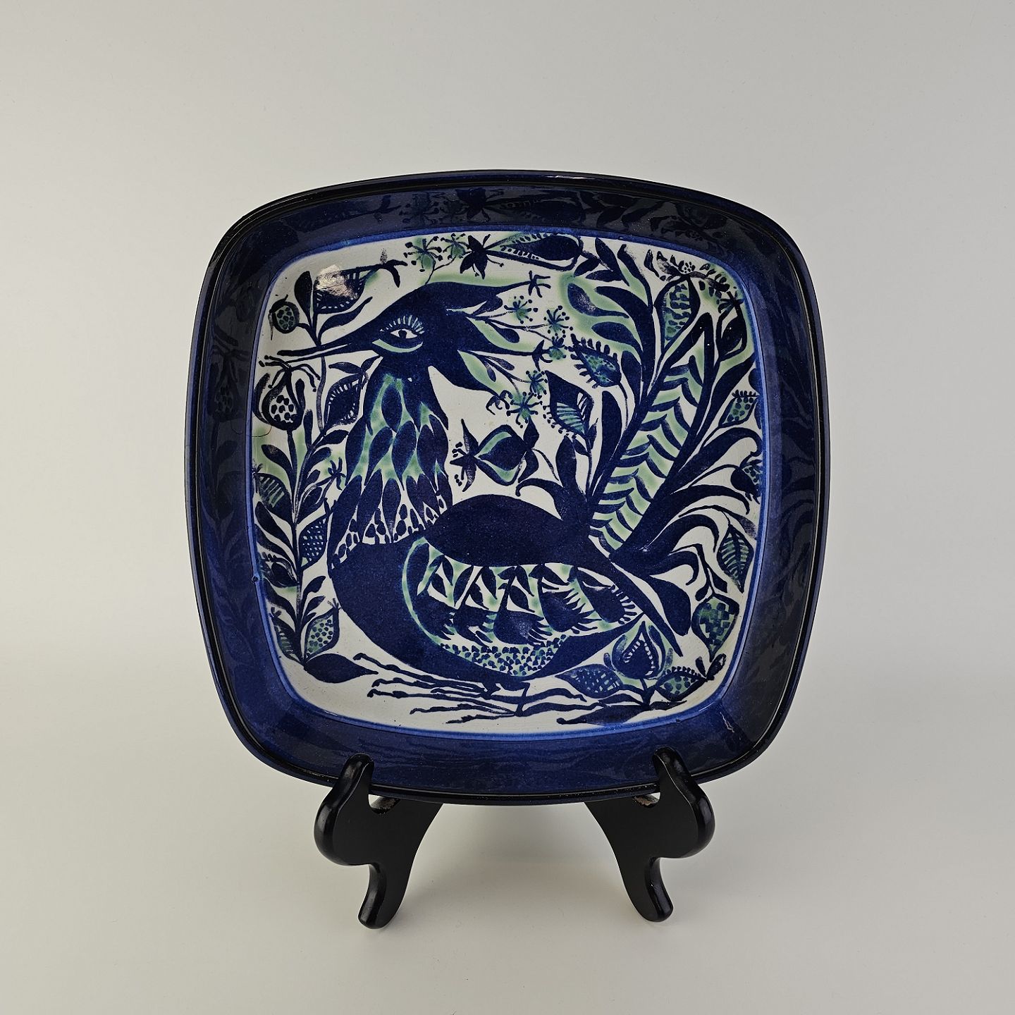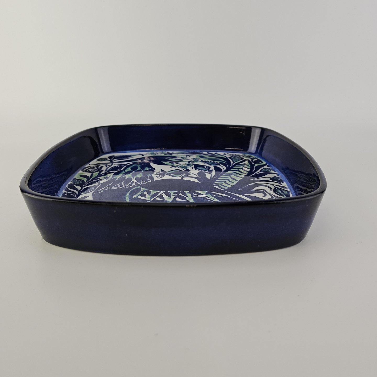 Firkantet fad fra serien Tenera i fajance med dekoration af en fugl i blå nuancer
