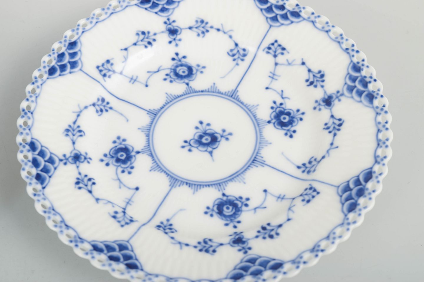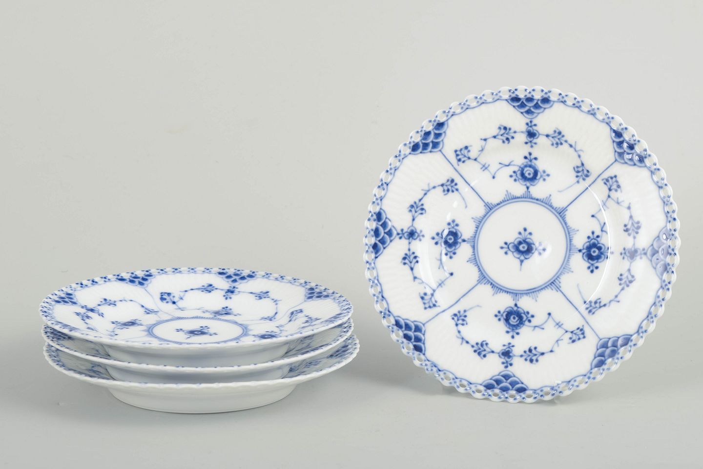 Sæt af fire kagetallerkener i håndmalet porcelæn fra Musselmalet Helblonde med klassisk underglasurdekoration i koboltblå og gennembrudt blondekant. Model 1/1088. Første sortering. Fremstillet i 1920’erne.