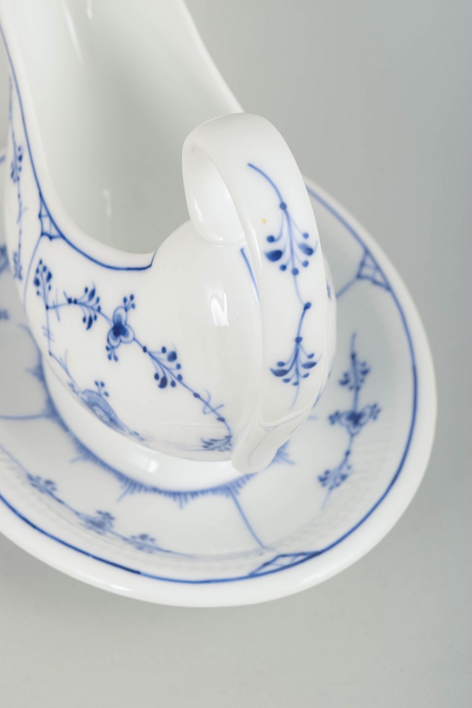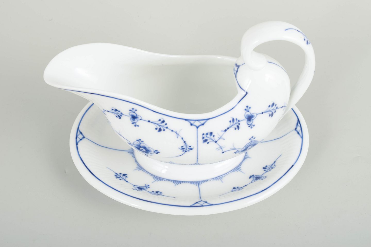 Sjælden antik sauceskål i håndmalet porcelæn fra Musselmalet Riflet med klassisk underglasurdekoration i koboltblå. Model 1/201. Med fast integreret underdel udført i ét stykke sammen med skålen. Første sortering. Fremstillet i 1890’erne.