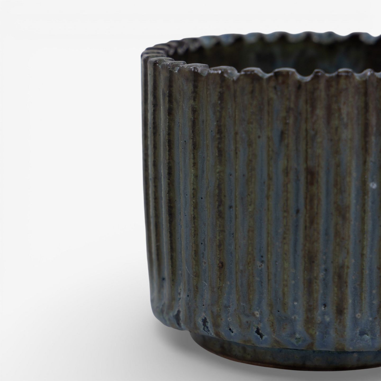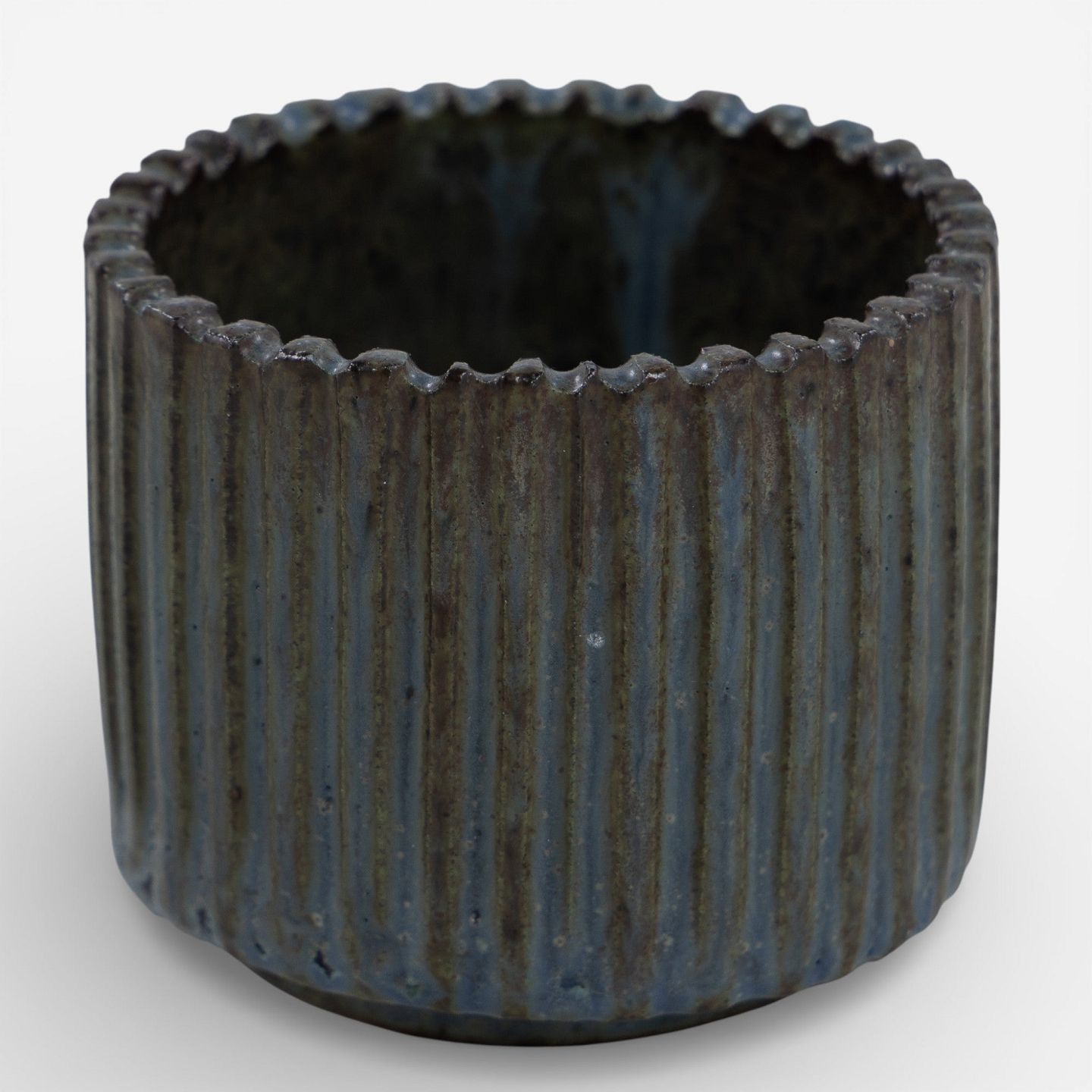 Krukke i riflet stentøj med blågrøn glasur. Signeret.
