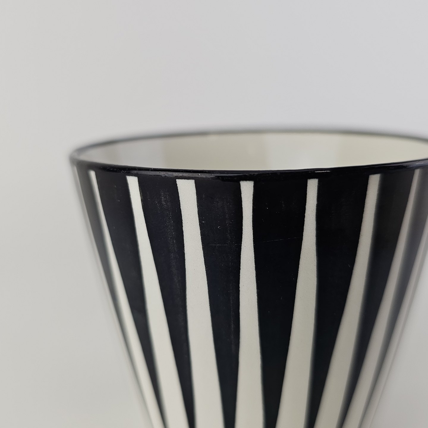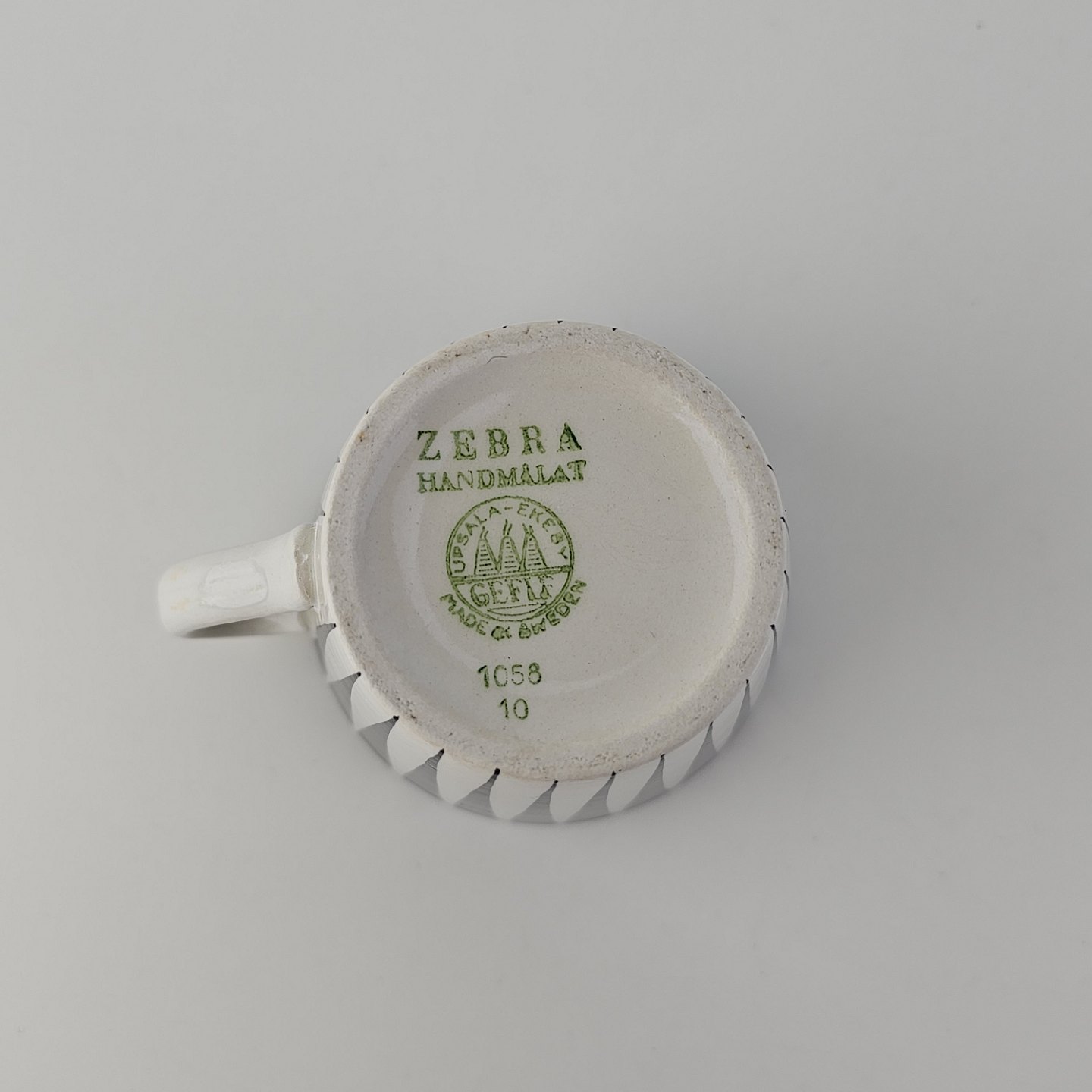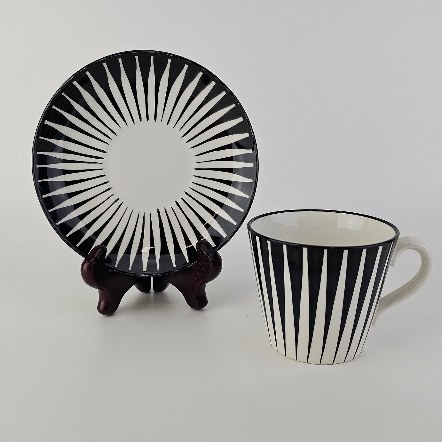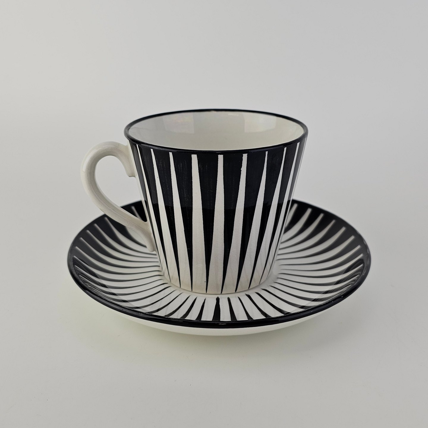 Håndmalet kop med underkop i fajance fra stellet Zebra med mønster i sorte og hvide striber.