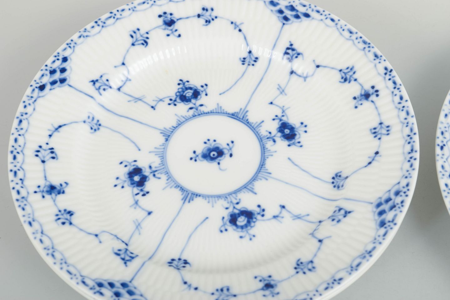 Sæt af tre små frokosttallerkener i håndmalet porcelæn fra Musselmalet Halvblonde med klassisk underglasurdekoration i koboltblå, riflede felter og karakteristisk blondekant.