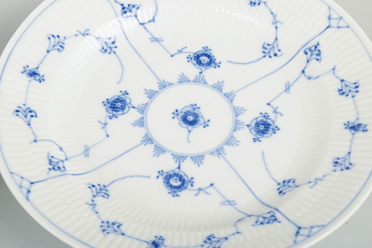 Royal Copenhagen Musselmalet Riflet, sæt af fire middagstallerkener.