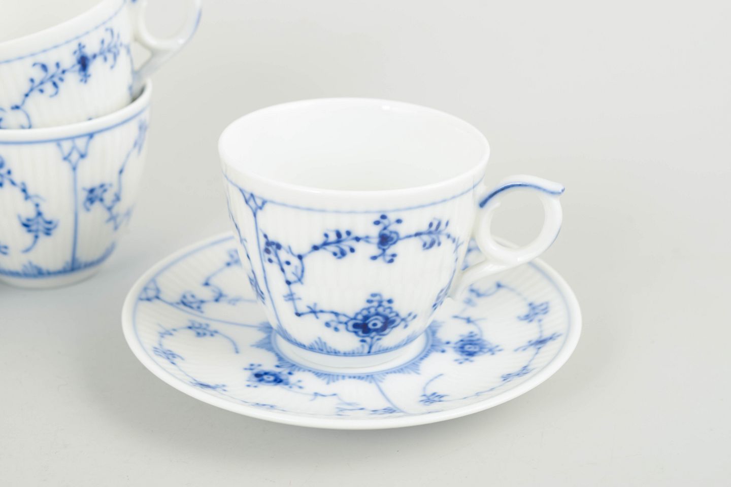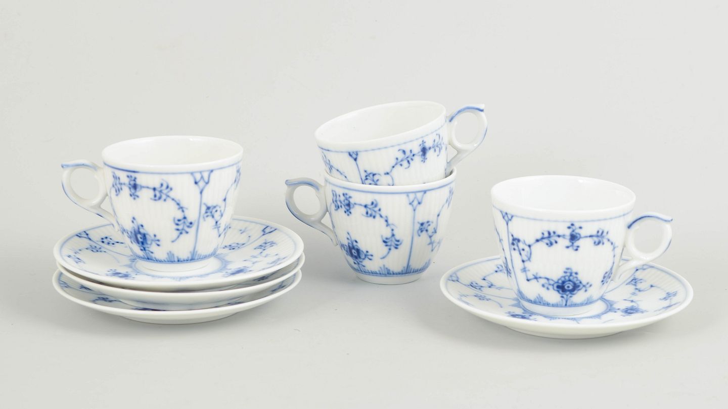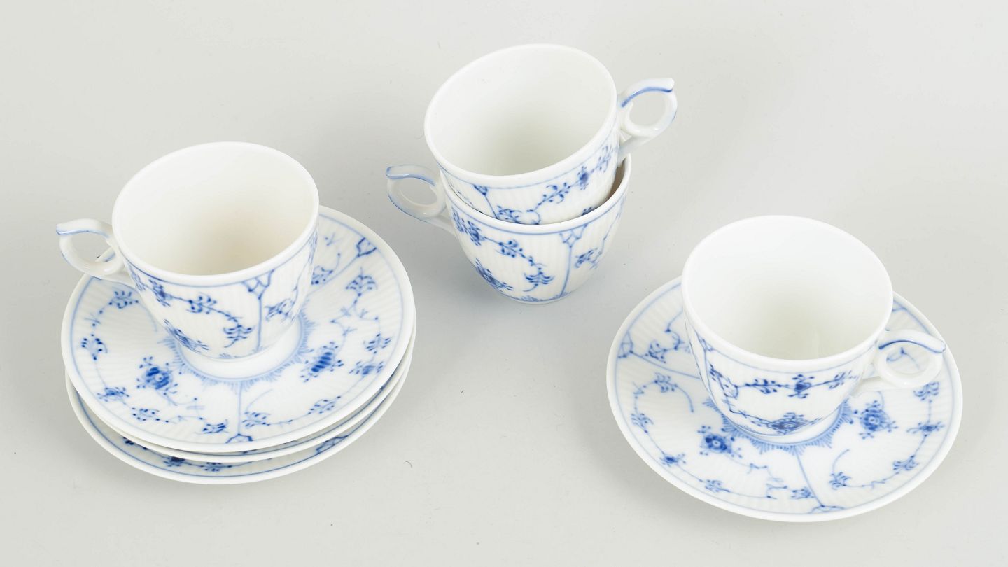 Royal Copenhagen Musselmalet Riflet, sæt på fire mokkakopper.