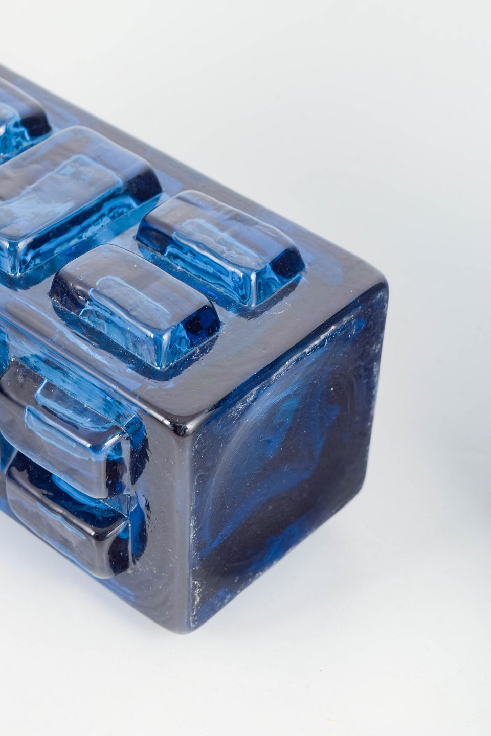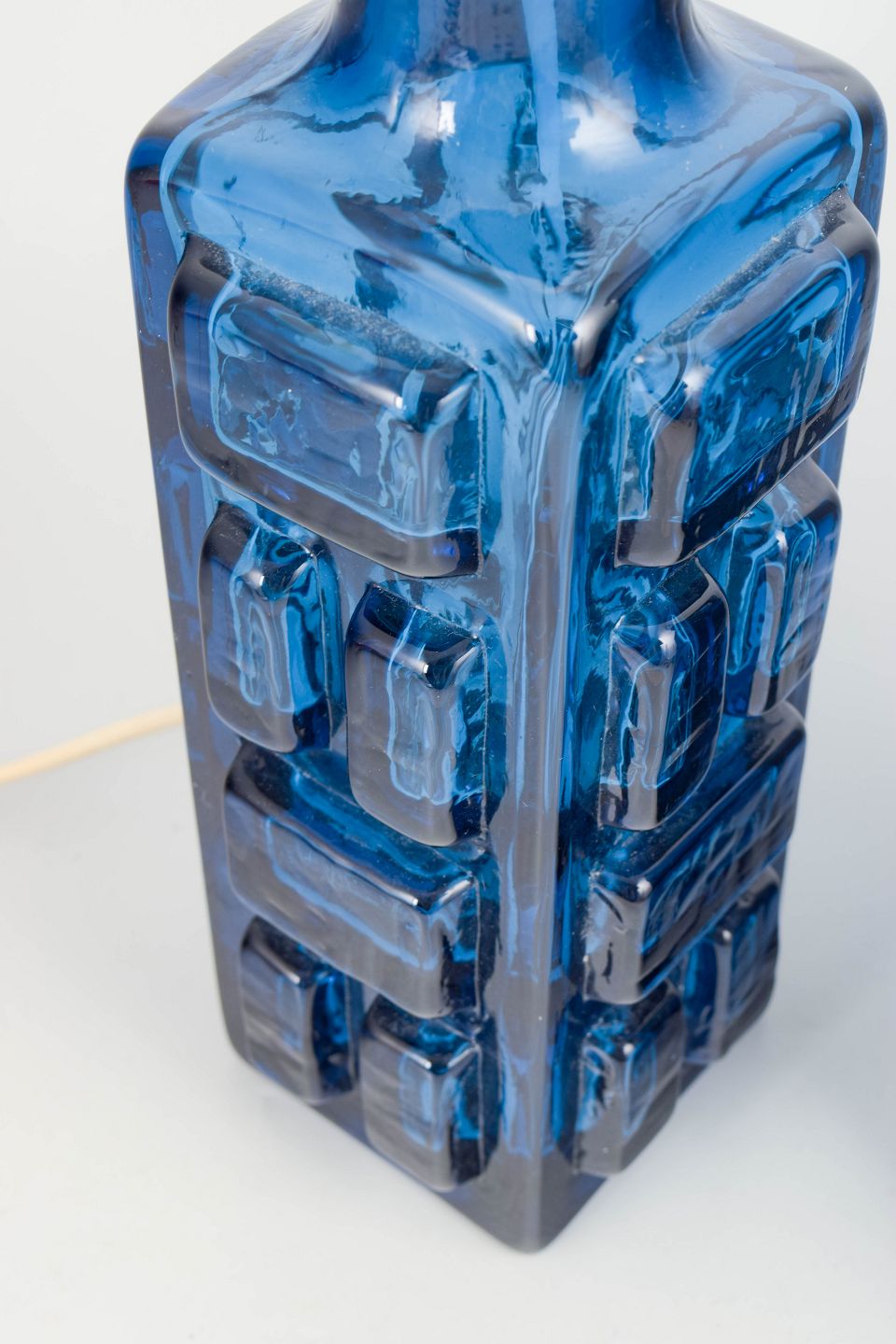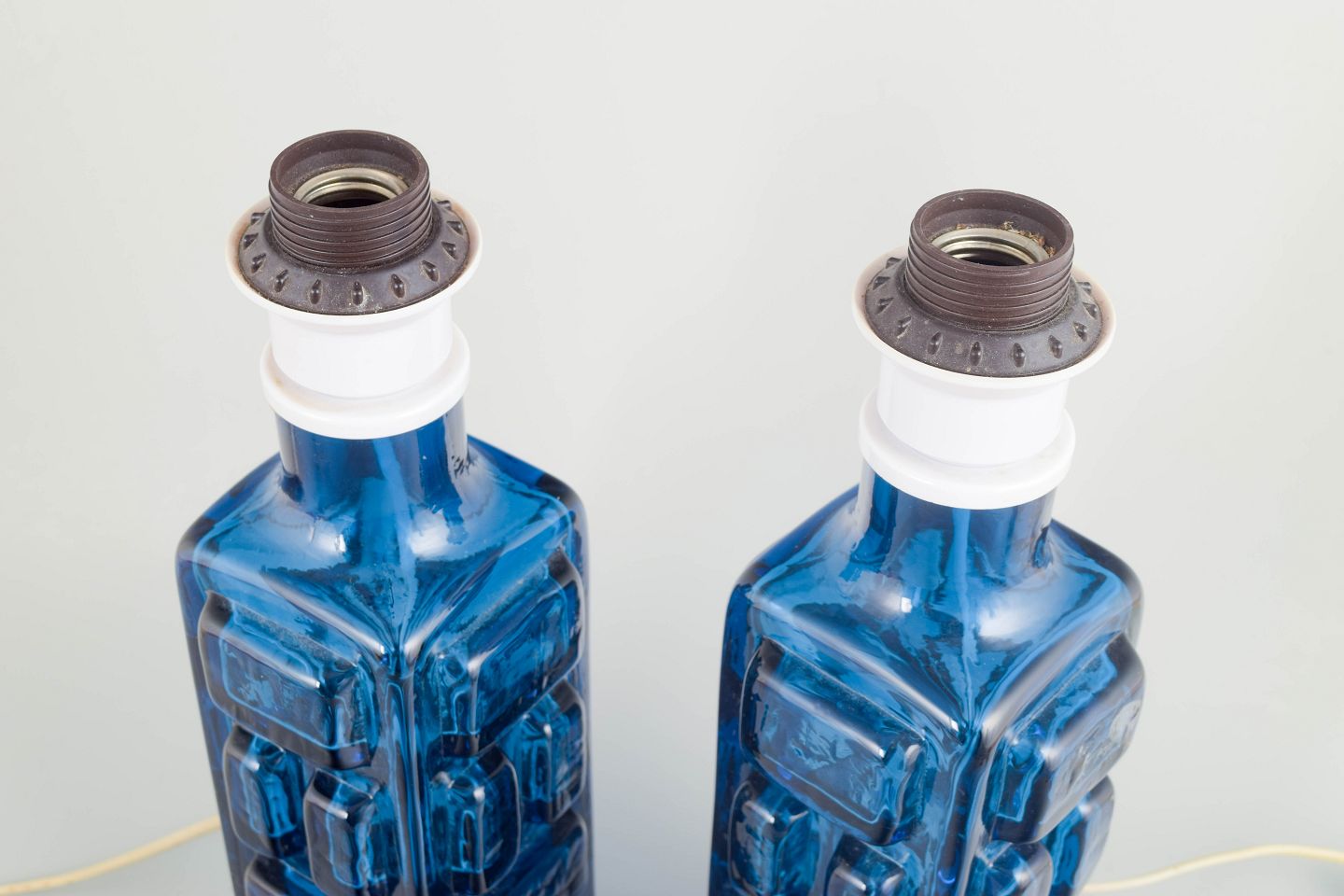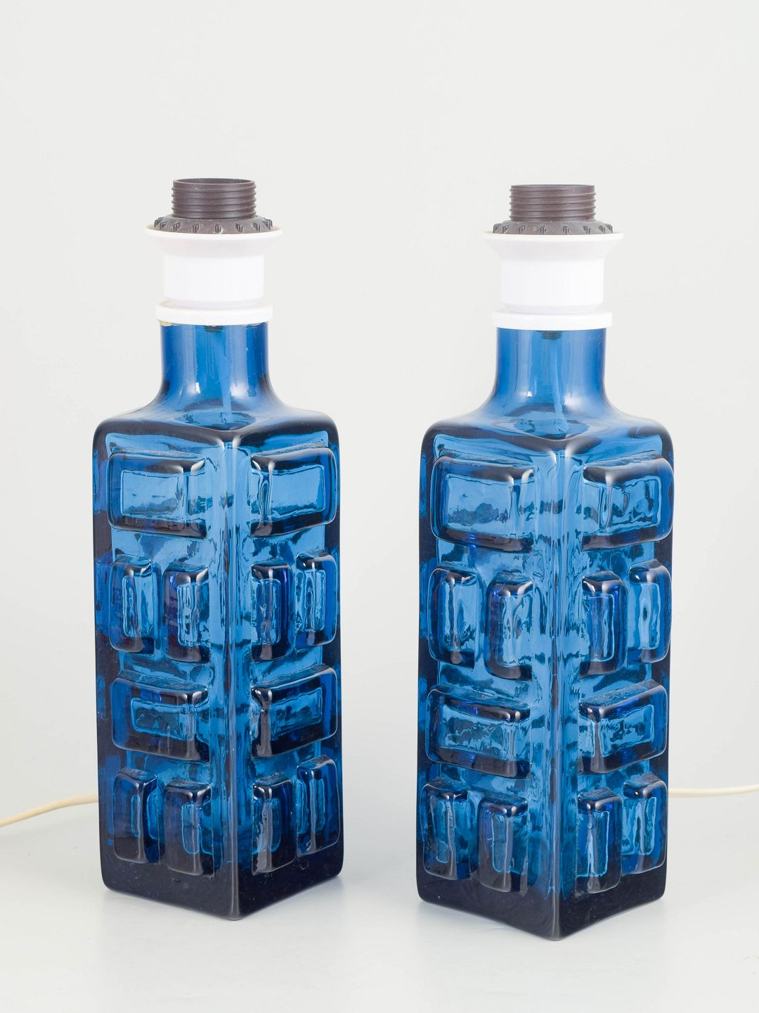Par bordlamper i blåt presset glas med geometrisk reliefdekoration. Fremstillet hos Pukeberg i Sverige i 1970’erne.