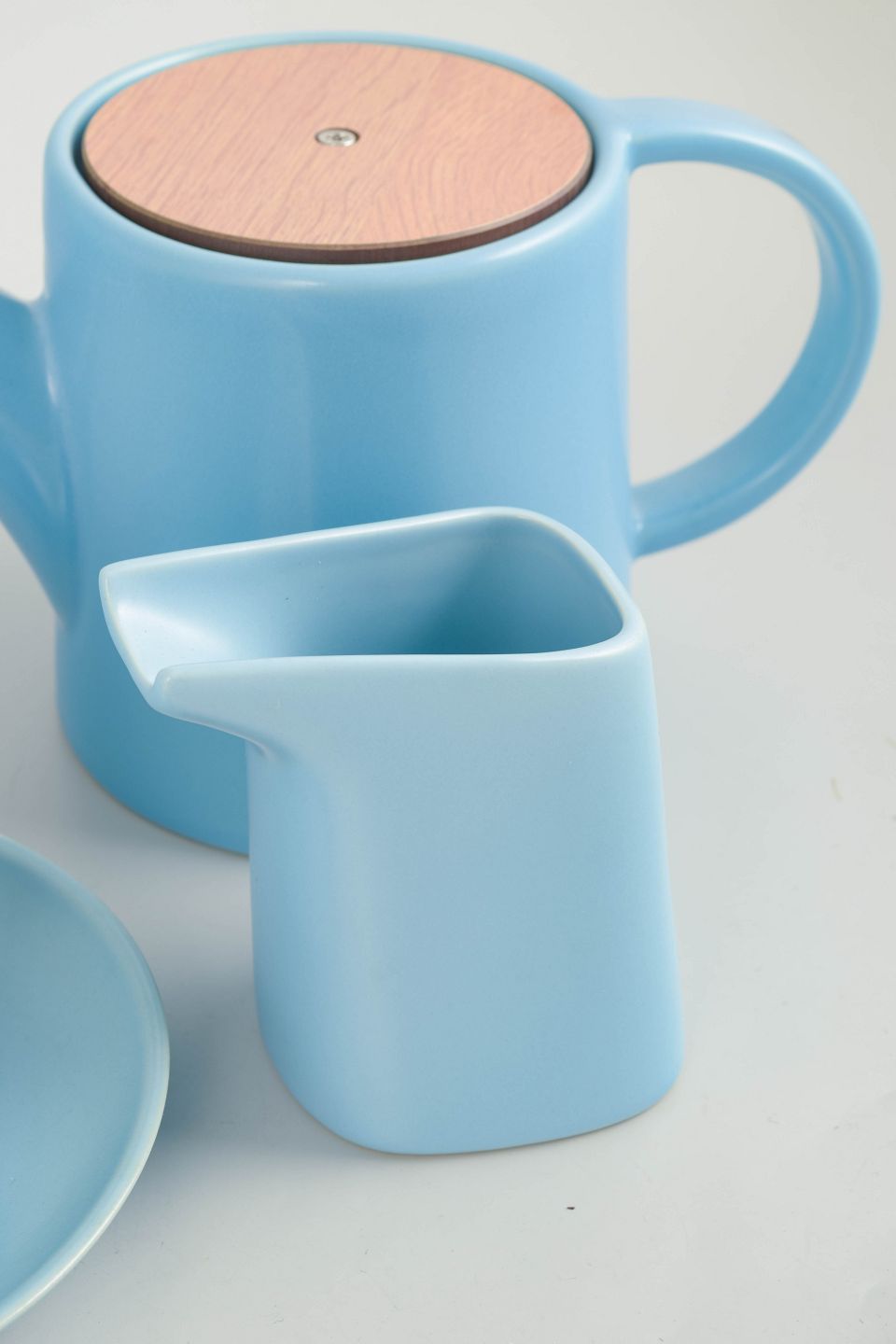 Tesæt i stentøj bestående af tre krus, tekande med tilhørende tesi, flødekande og underkopper. Udført i lyseblå glasur med enkle moderne former. Stemplet Höganäs Keramik, Made in Sweden model 3.