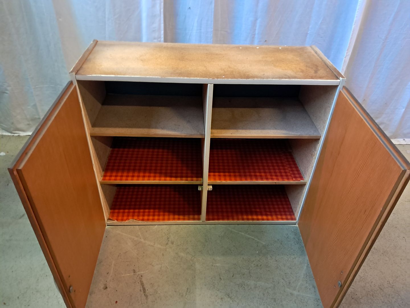 Gammelt malet køkkenskab med låger i origon pine, fra 1960erne.