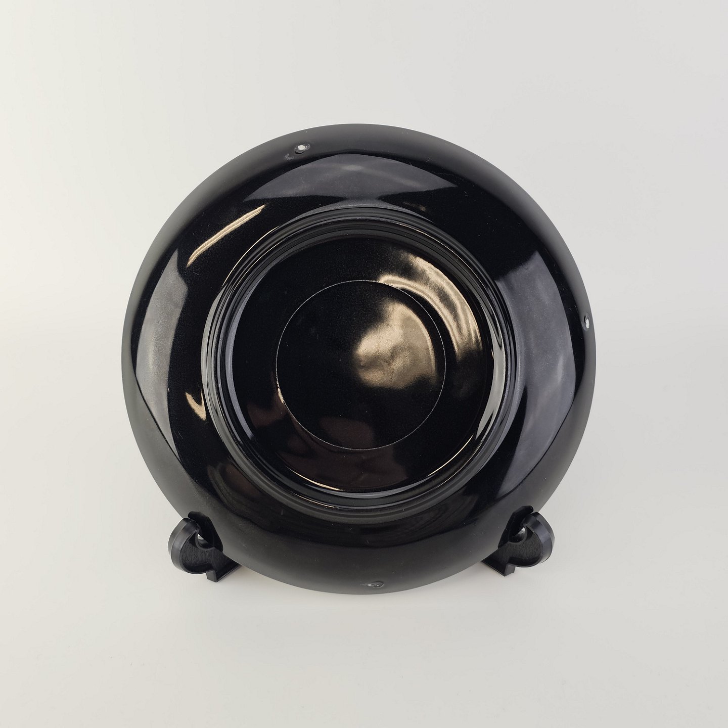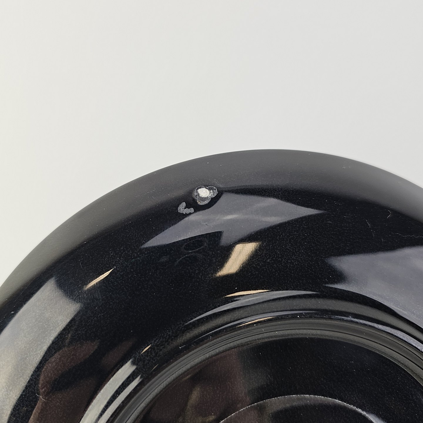 Fremstår med to mærker på bagsiden, som er holdemærker fra glaseringsprocessen