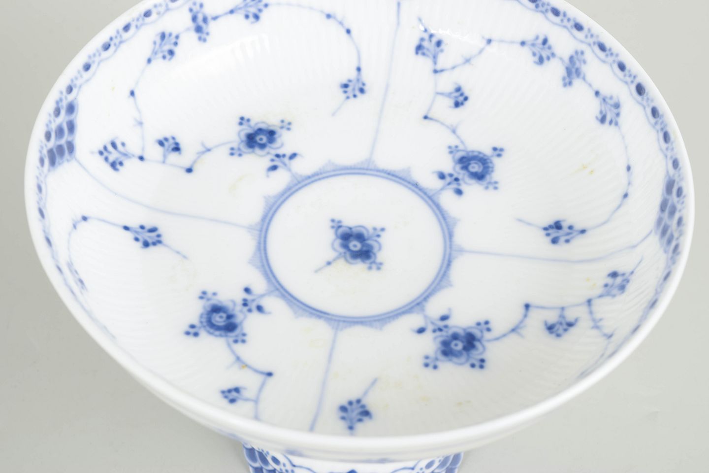 Opsats i håndmalet porcelæn fra Musselmalet Halvblonde med klassisk underglasurdekoration i koboltblå og karakteristisk blondekant. Model 1/513 og 1/514. H. 14 cm, D. 21 cm. Første sortering. Fremstillet i 1920’erne.