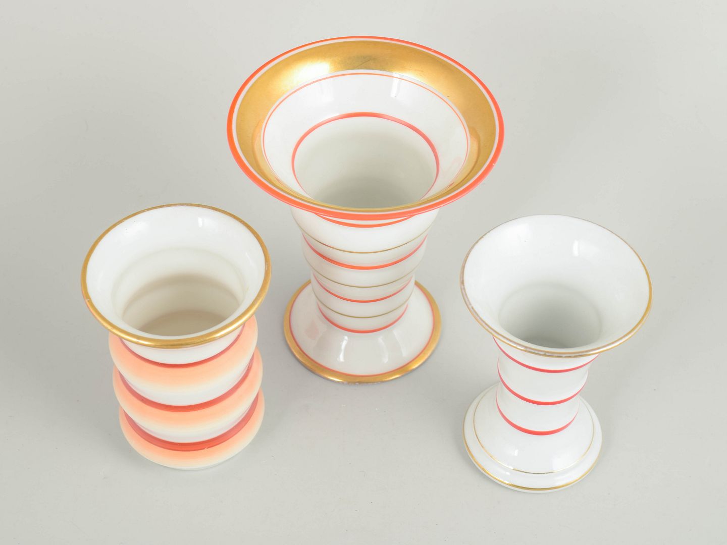 Tre små vaser i porcelæn med klassiske art deco former og dekoration i hvide nuancer med koralrøde stafferinger og guldkant. Vaserne fremstår med elegante proportioner og karakteristisk stil fra tysk porcelænsproduktion i mellemkrigstiden.