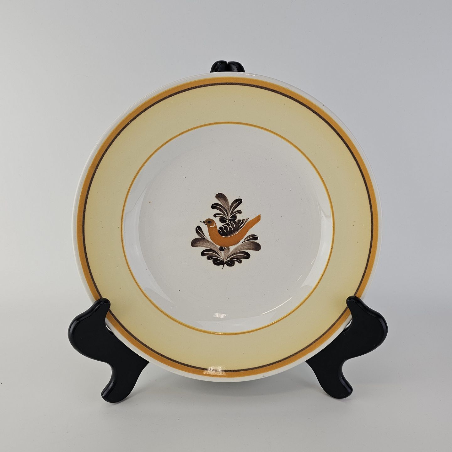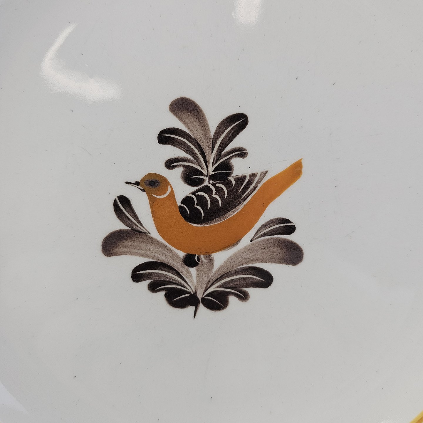 Hvidt fajancestel i stelform G med motiv af en orange og brun fugl og kant.