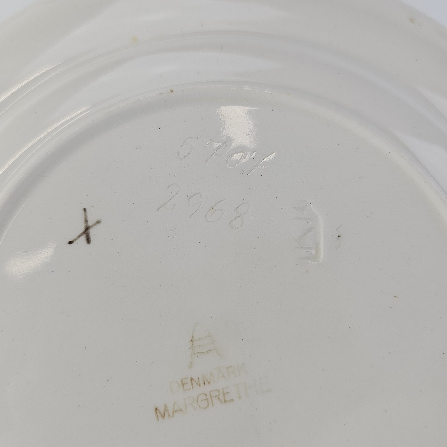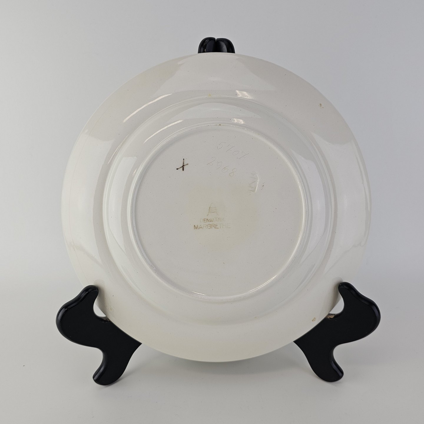 Flad frokosttallerken i fajance fra stellet Margrethe fremstillet i perioden 1937-1940.