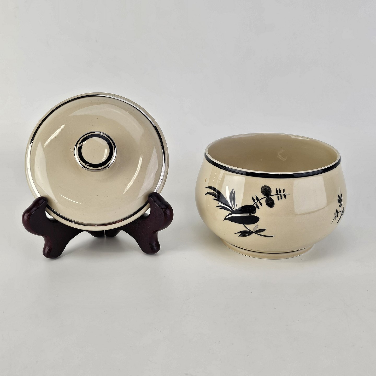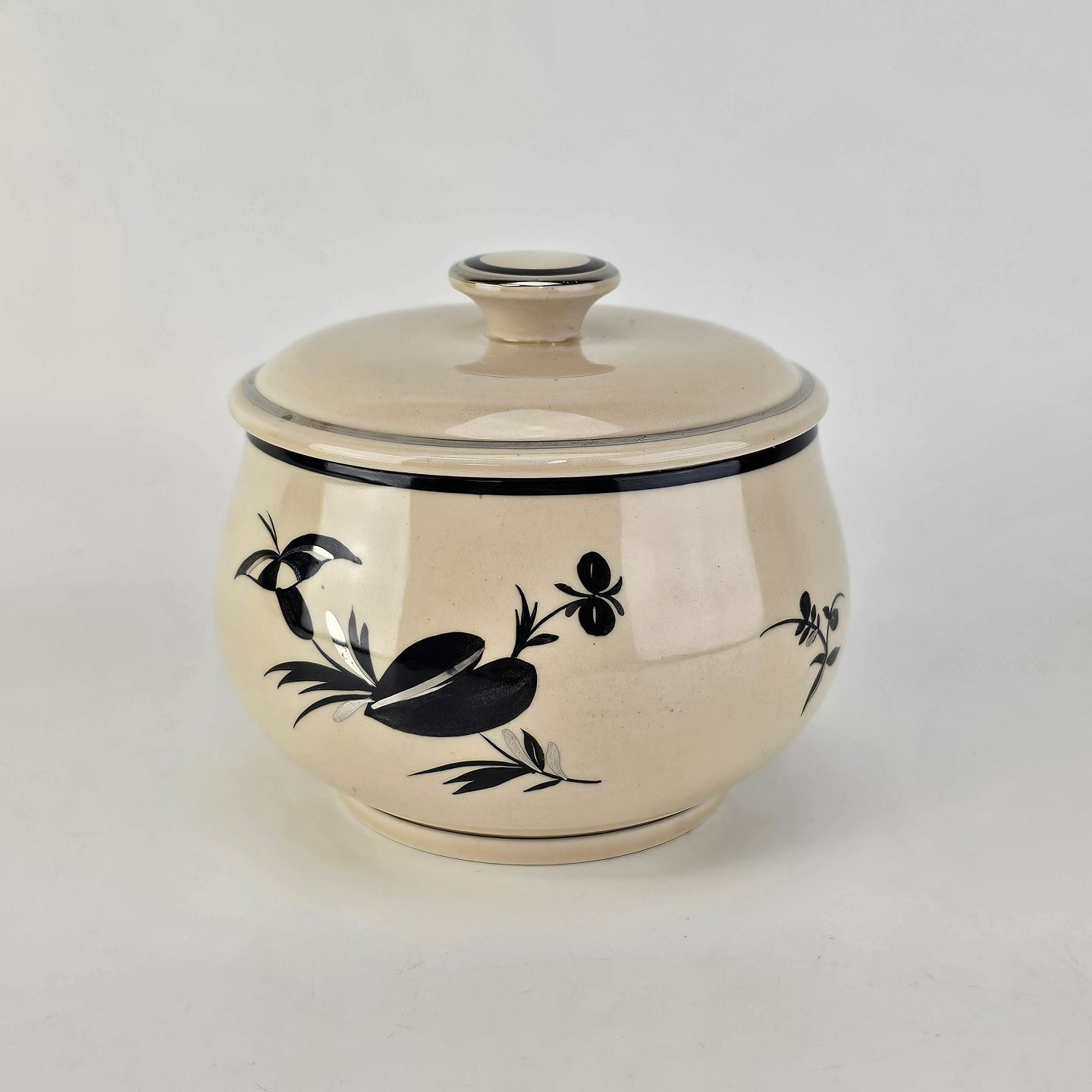 Råhvidt fajancestel i stelform E med dekoration af naturmotiver i sølv og sort farve.