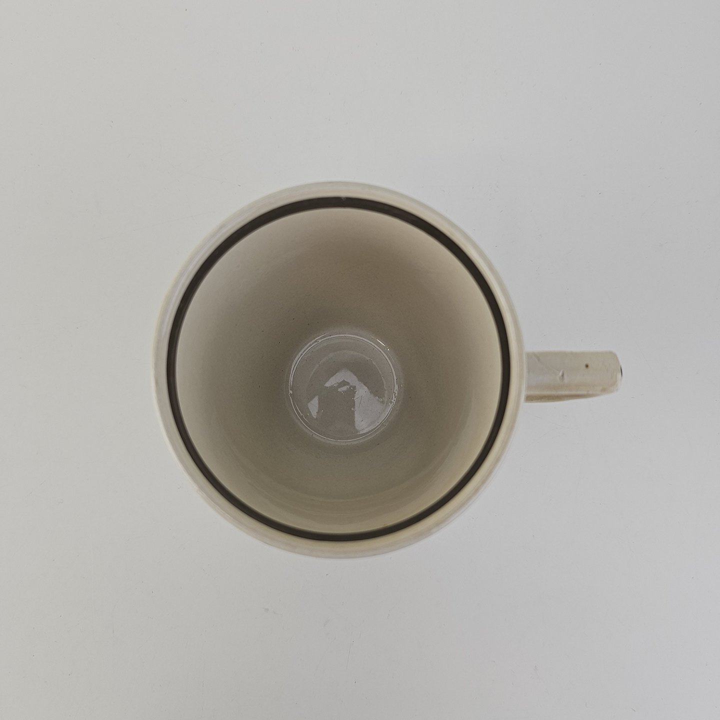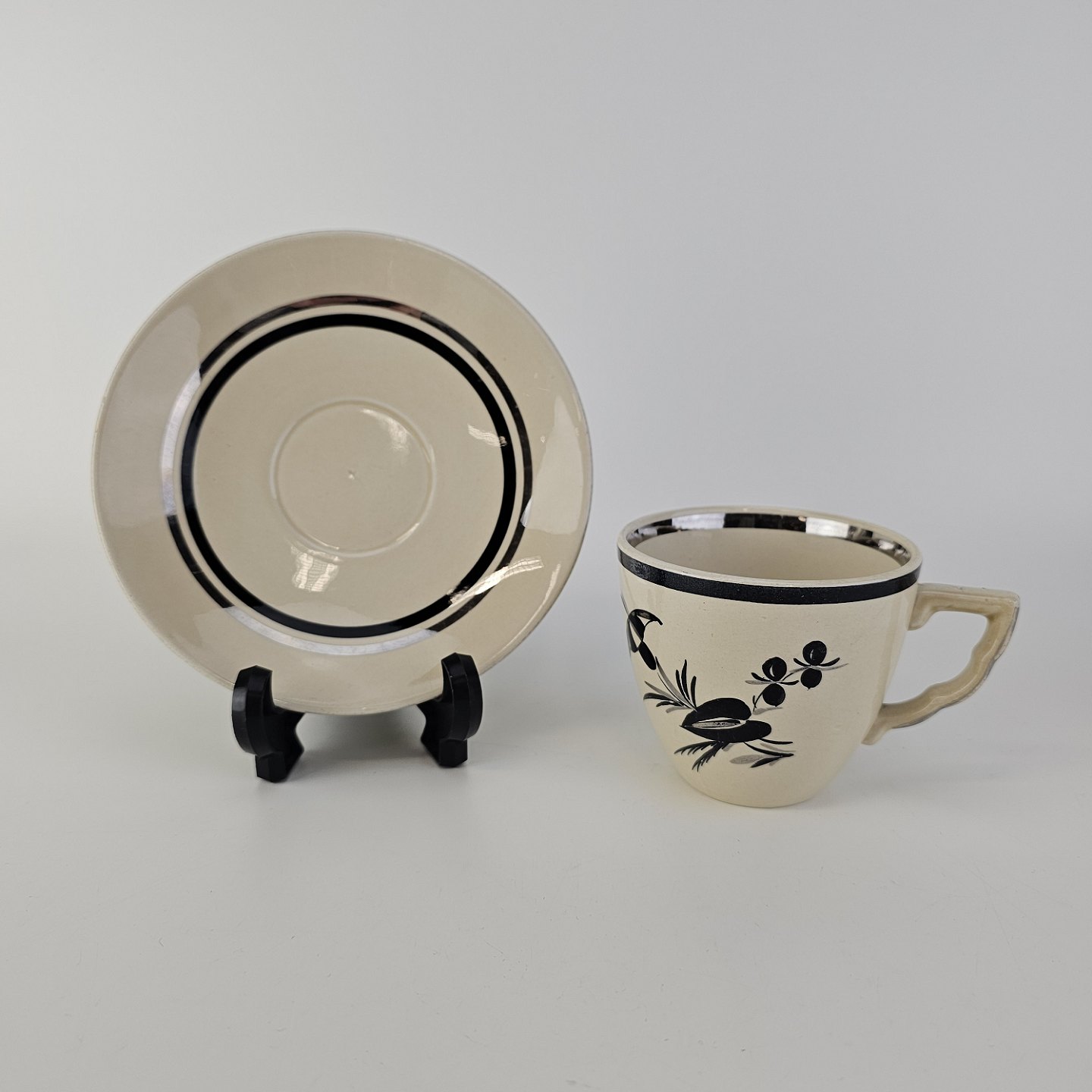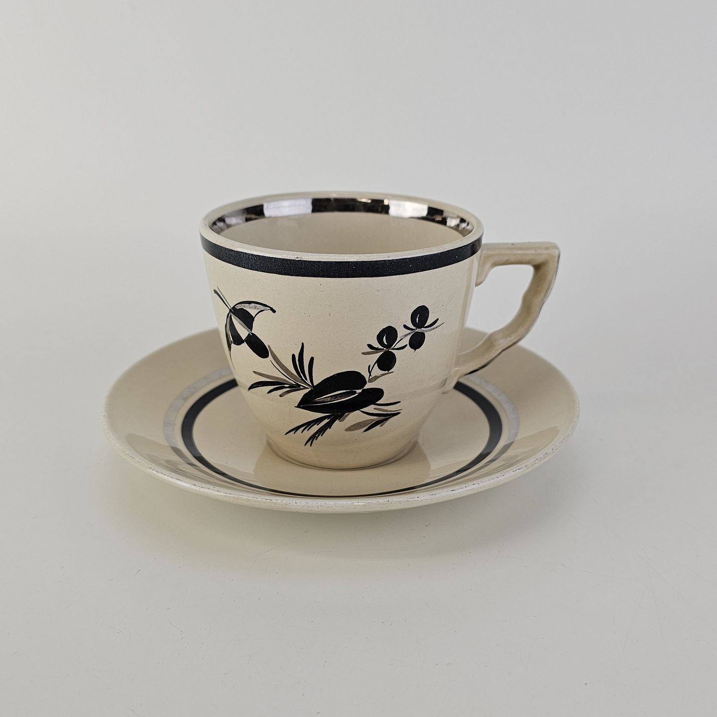 Kop med underkop med art nouveau hank i fajance fra stellet Dragsholm fremstillet i perioden 1934-1965.