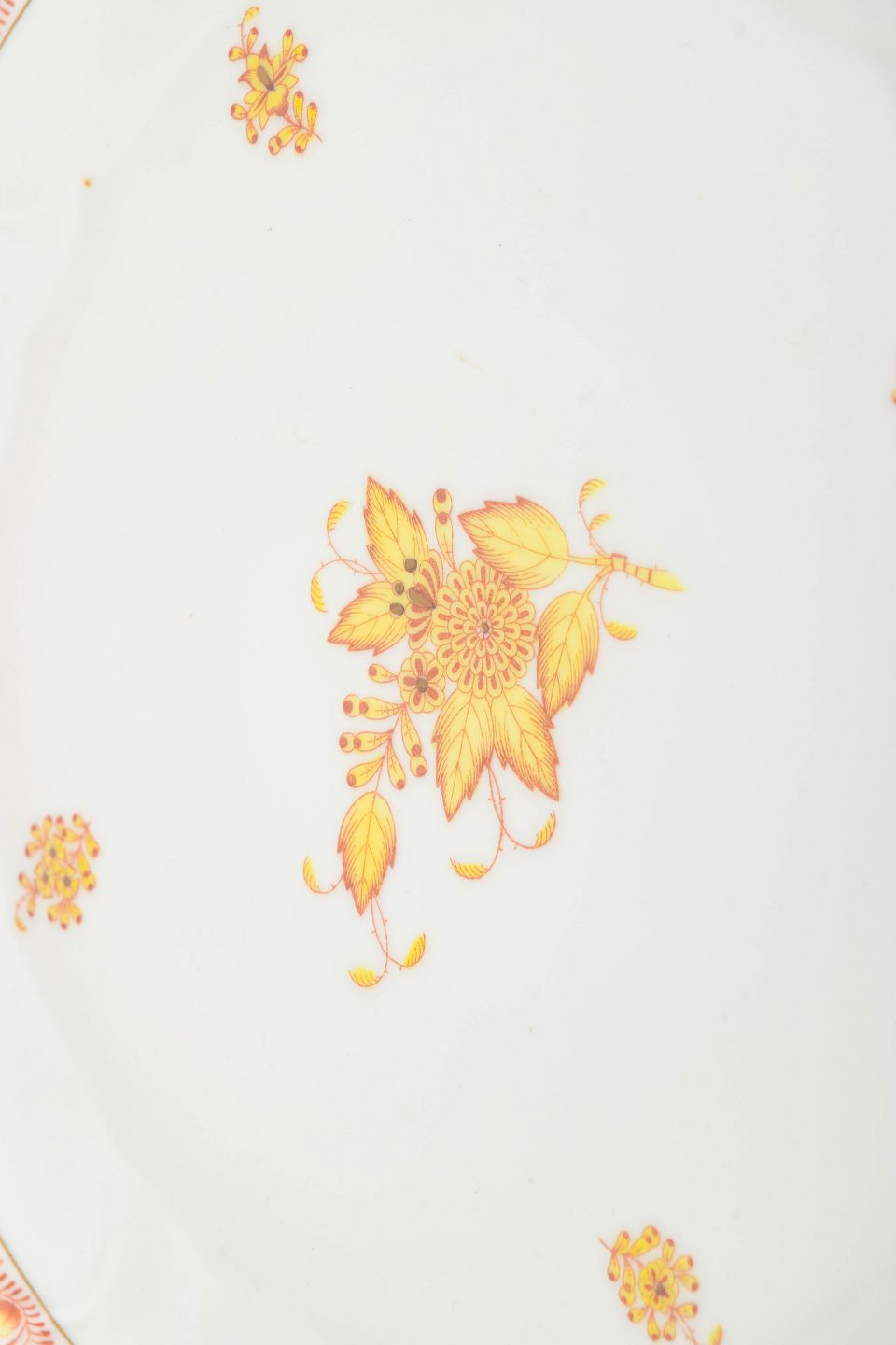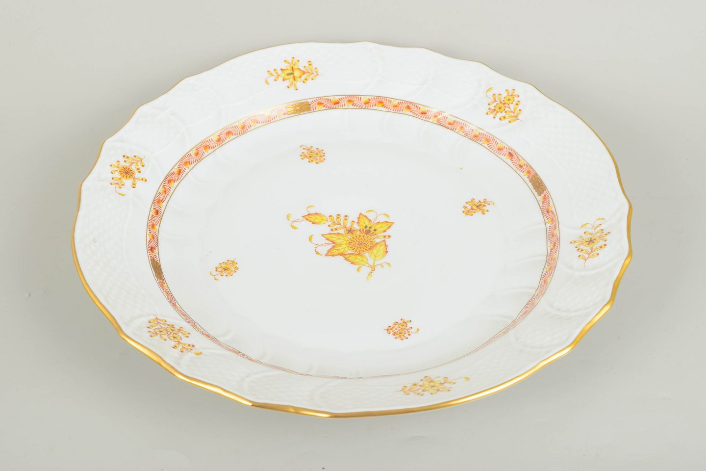 Imponerende og generøst porcelænsfad fra Herend dekoreret i Chinese Bouquet med central blomsterbuket i gyldne og varme nuancer, omgivet af fine spredte blomstermotiver og elegant guldkant. Den let bølgede rand og diskrete reliefstruktur understreger fadets klassiske og harmoniske udtryk. Et markant serveringsfad fra midten af det 20. århundrede med fornem håndmalet dekoration.