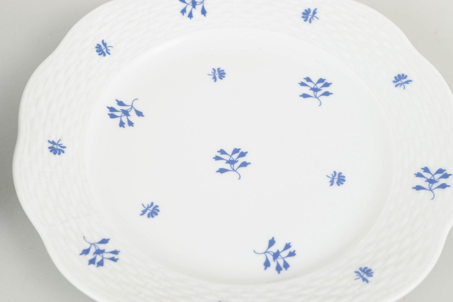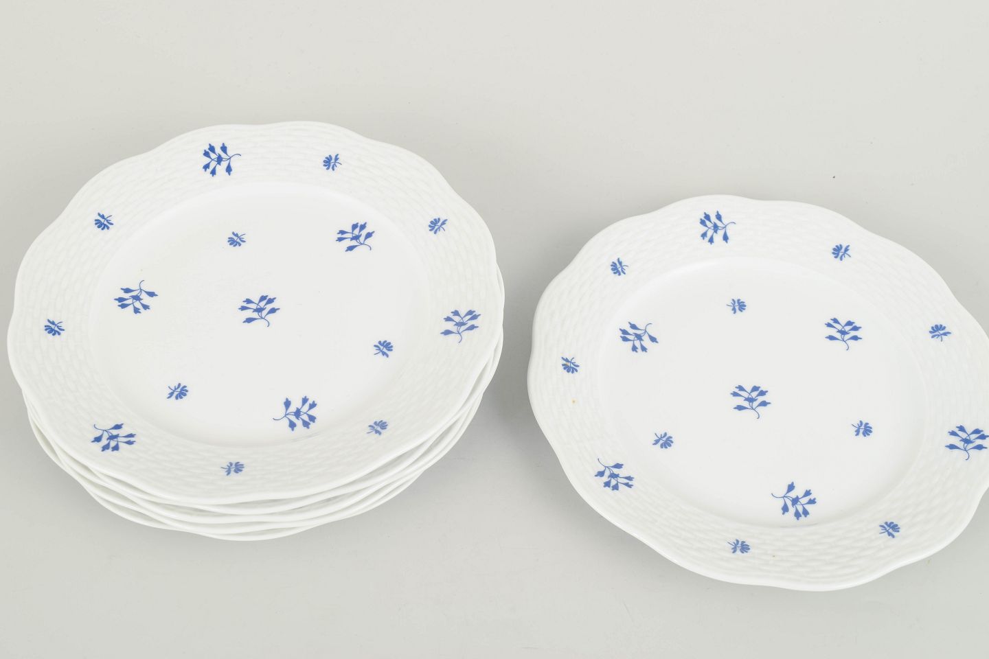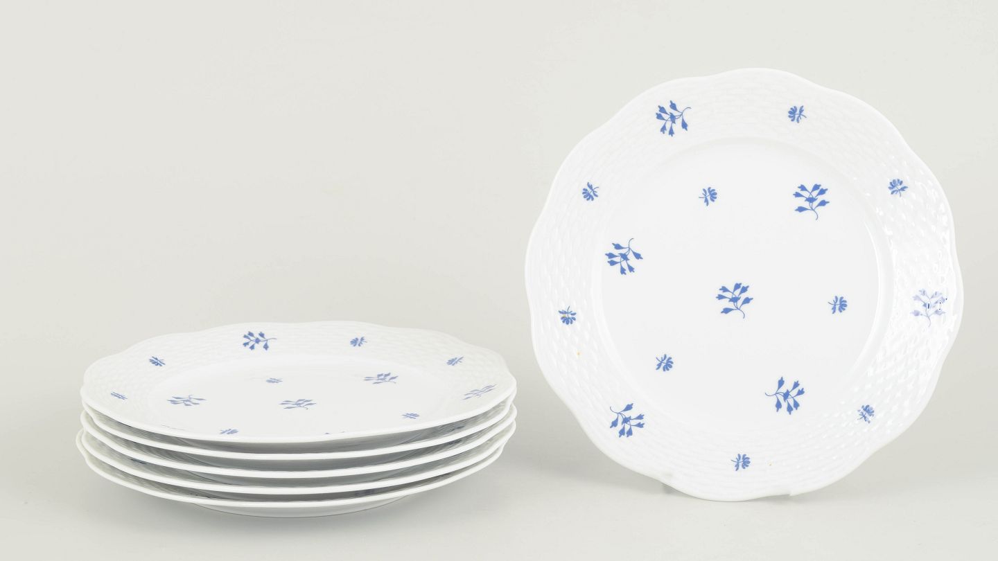Elegant sæt af seks håndmalede porcelænstallerkener fra Herend med diskret blå blomstermotiv fordelt over fanen og midterfeltet. Den let bølgede rand og fine reliefstruktur giver en klassisk og raffineret fremtoning, karakteristisk for fabrikkens mellemkrigsproduktion. Et harmonisk og dekorativt stel i mindre format.