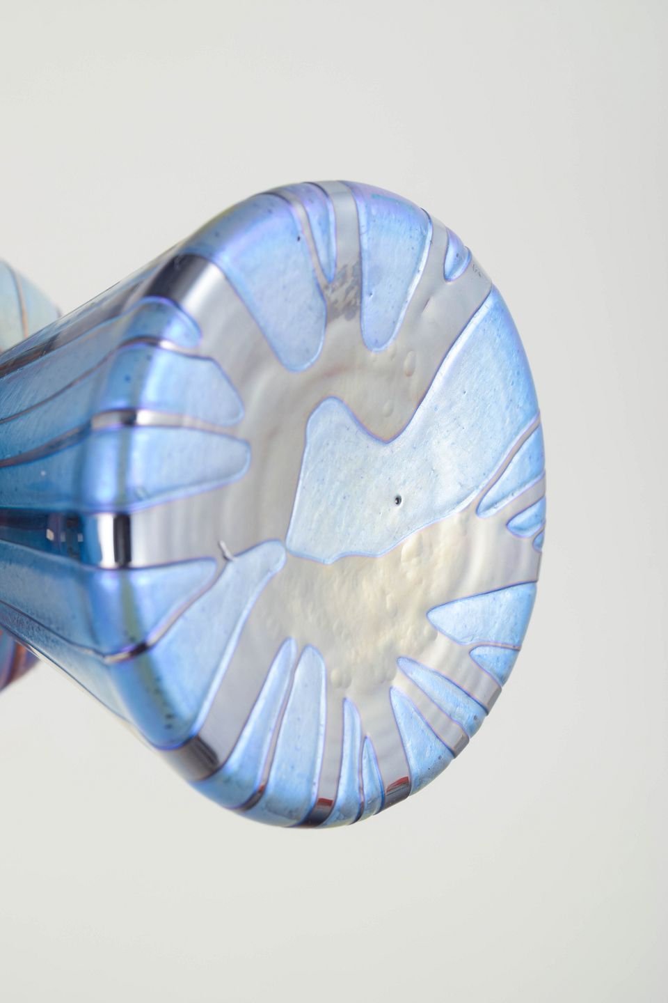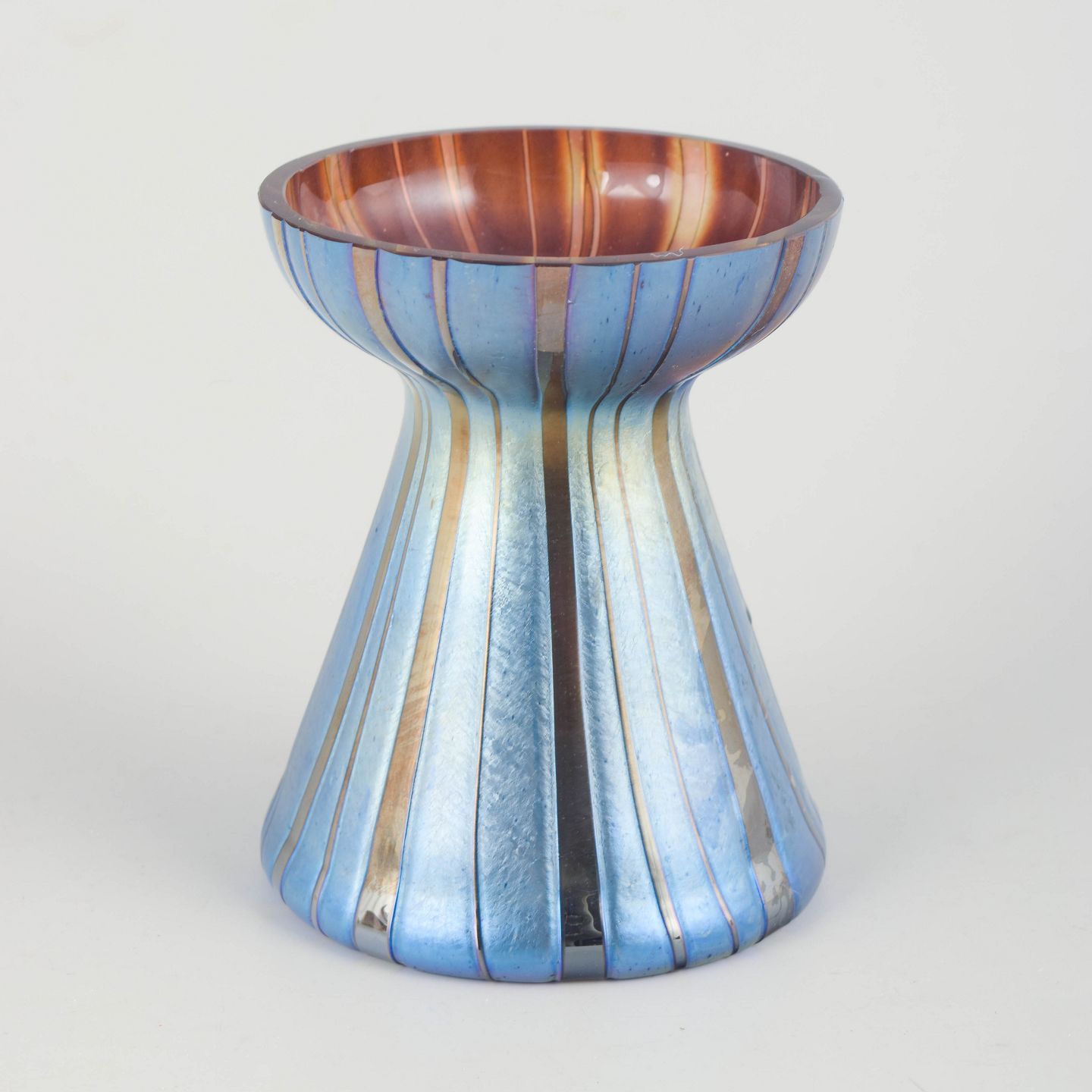 Markant vase i mundblæst glas med kraftig iriserende overflade i blå og kobberfarvede nuancer. Formen er timeglasagtig med bred, tragtformet munding og smallere midterparti. Den lodrette, ribbede struktur og det metalliske farvespil er karakteristisk for Loetz’ produktion i 1920’erne, hvor geometriske og mere stramt artikulerede former afløste den tidligere, mere organiske art nouveau-stil.