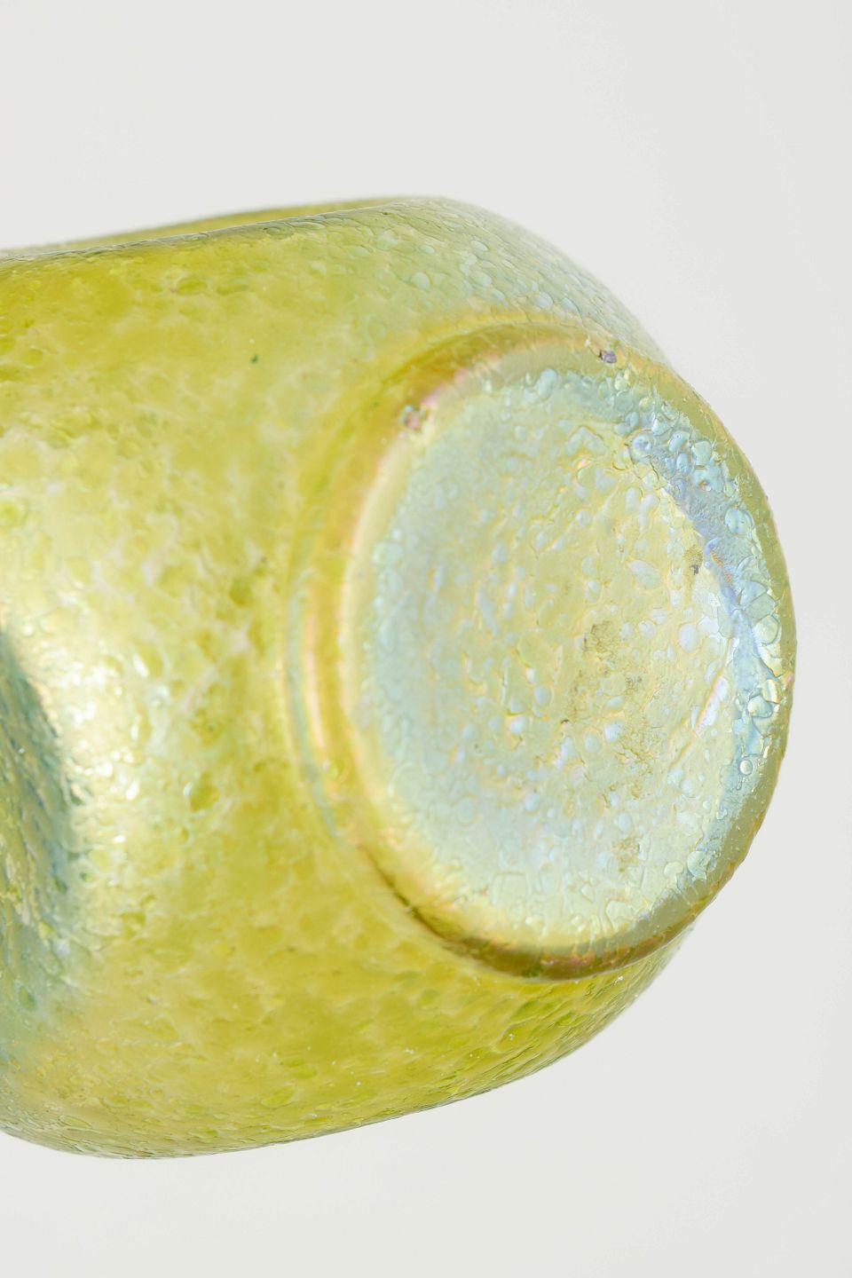Kompakt vase i mundblæst glas med kraftig iriserende overflade i gulgrønne og blålige nuancer. Den rundede korpus med let udadbøjet hals og subtile, organiske strukturer i glasset er karakteristisk for Loetz’ mellemkrigsproduktion, hvor levende farvespil og metallisk glans var centrale virkemidler.