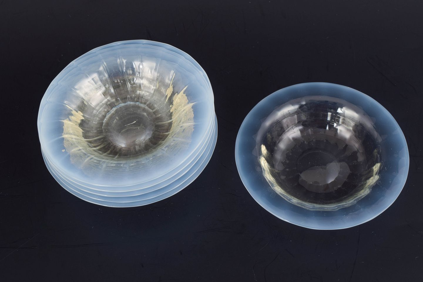 Seks små kunstglasskåle udført i europæisk studioglas med klar, let rillet form og blødt buet profil. Skålene har en harmonisk, organisk silhuet og fremstår med elegant gennemsigtighed.