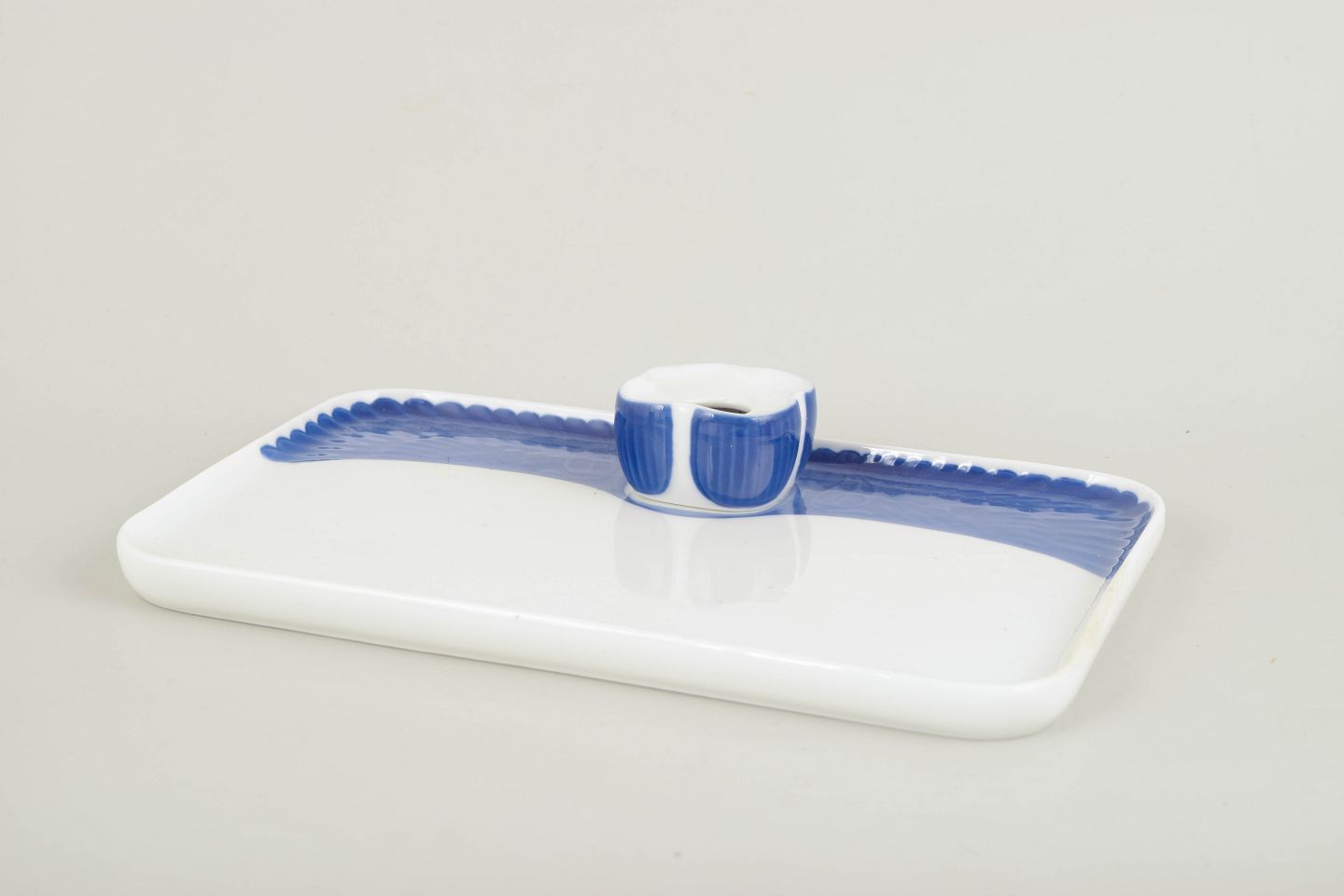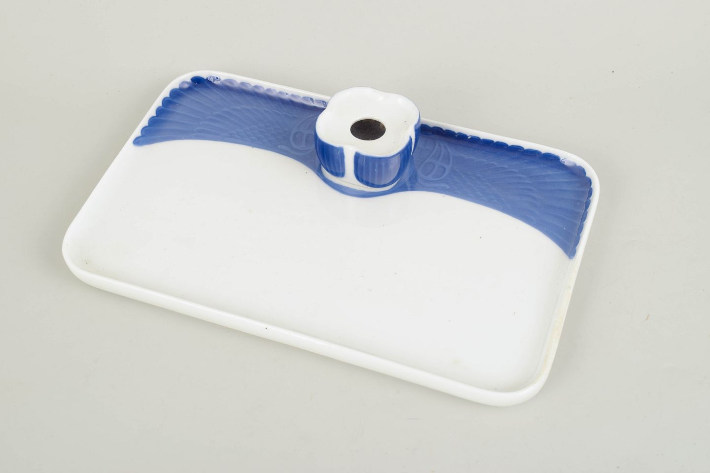 Sjældent Art Nouveau blækhus i hvidt porcelæn med integreret firkantet blækindsats og dekoration i underglasurblå riflet bort.