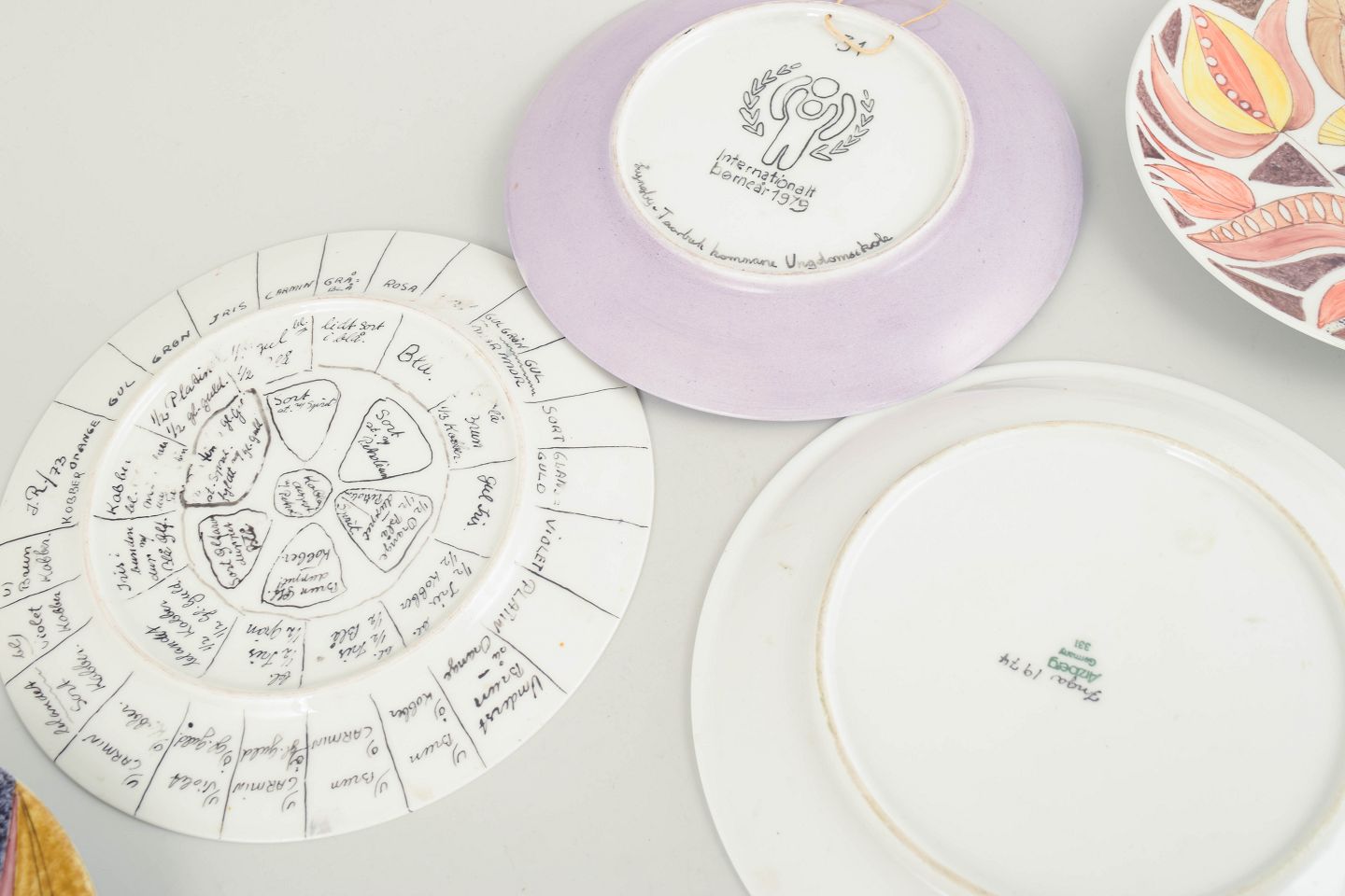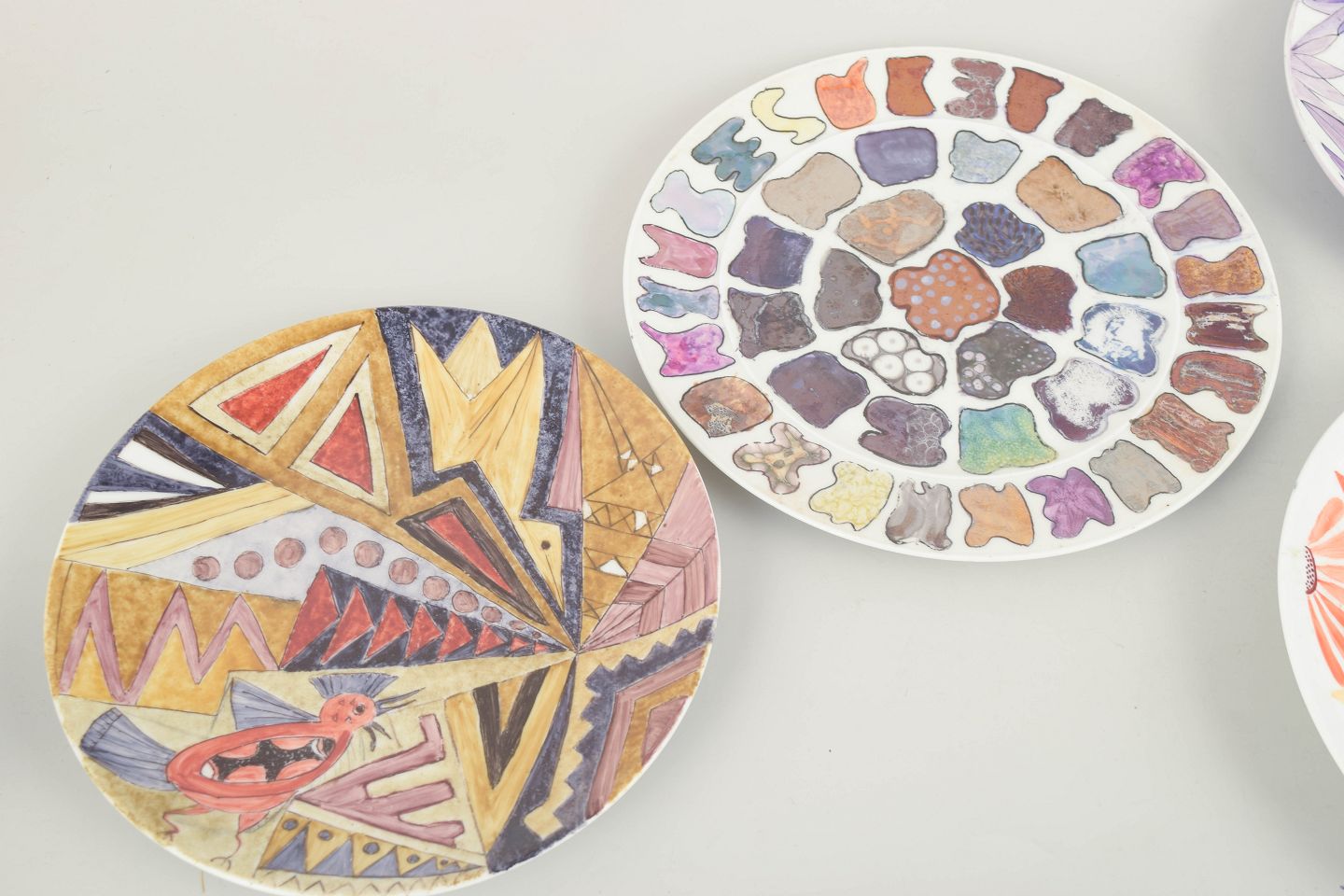 Dekorative tallerkener i håndmalet porcelæn med individuelle mønstre i organiske og geometriske former i varme og violette farvetoner.