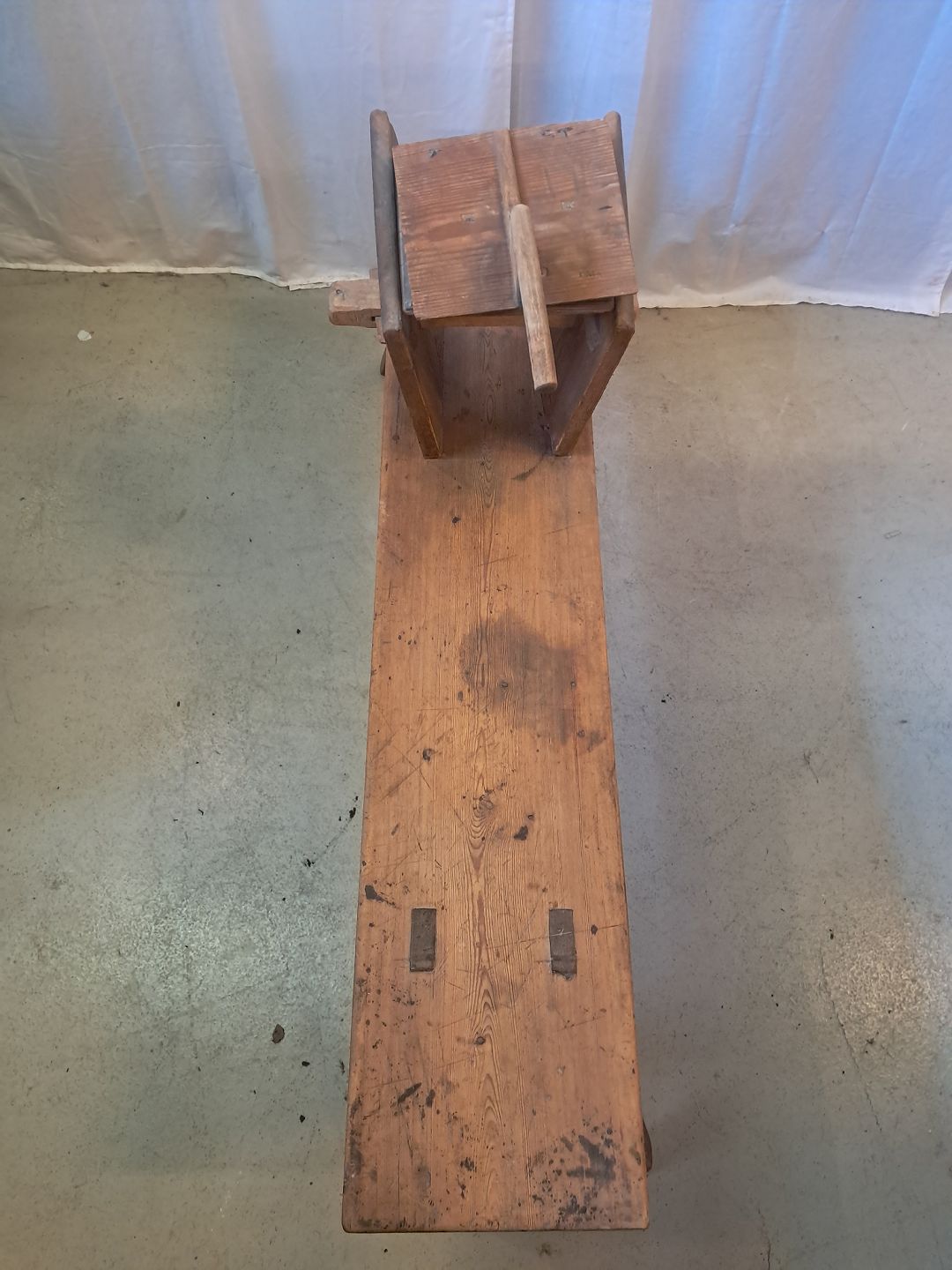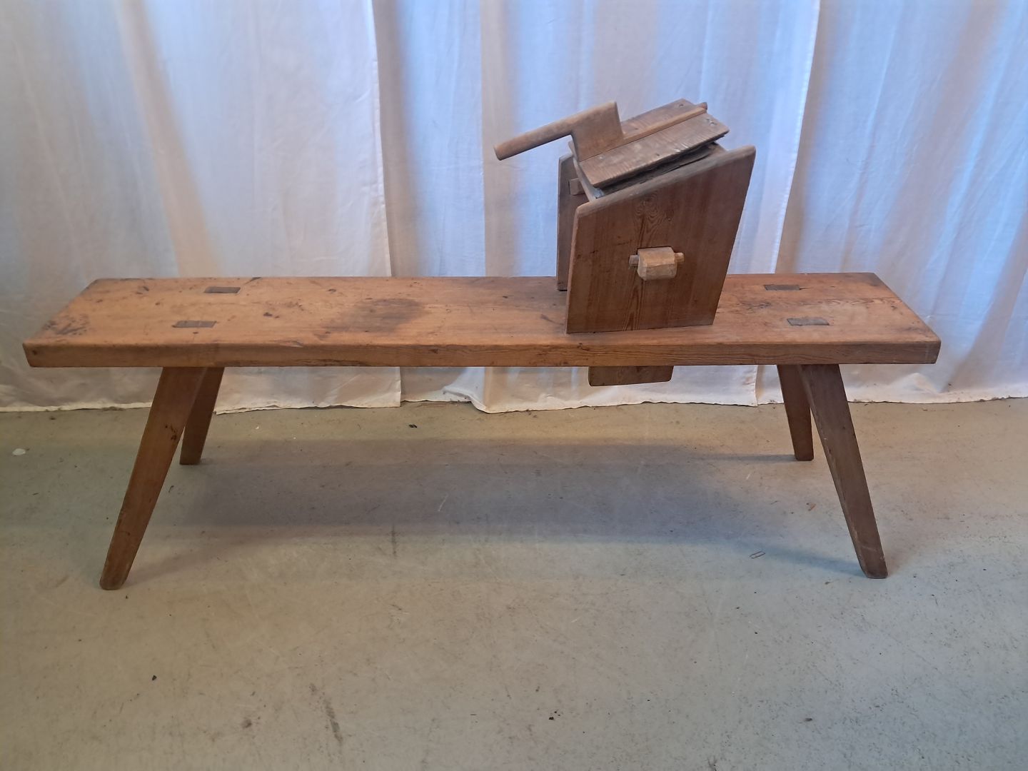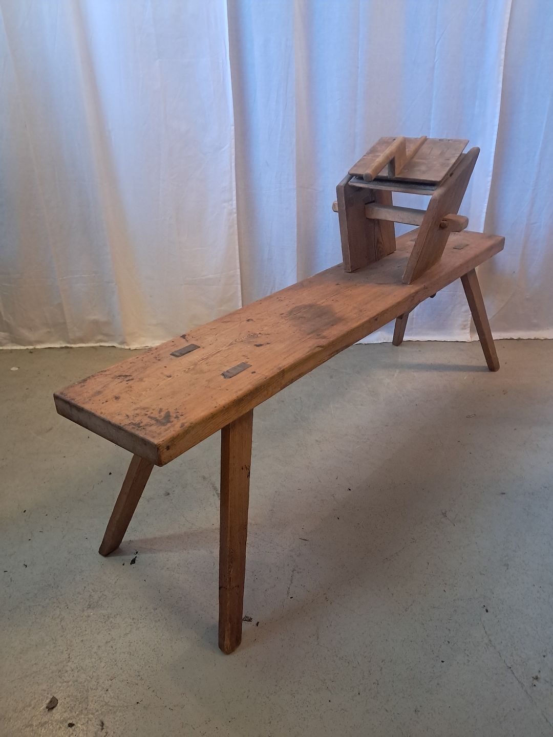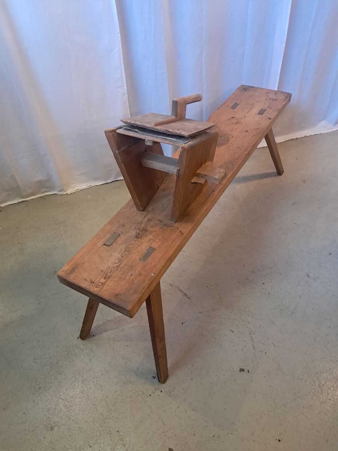 Bænk til uldkarding i massivt fyrretræ, fra 1910erne.