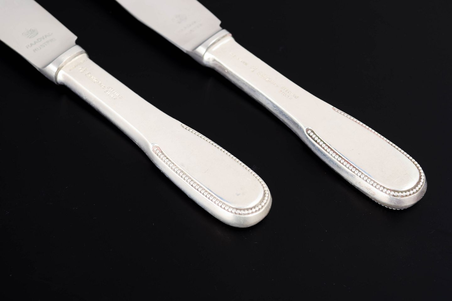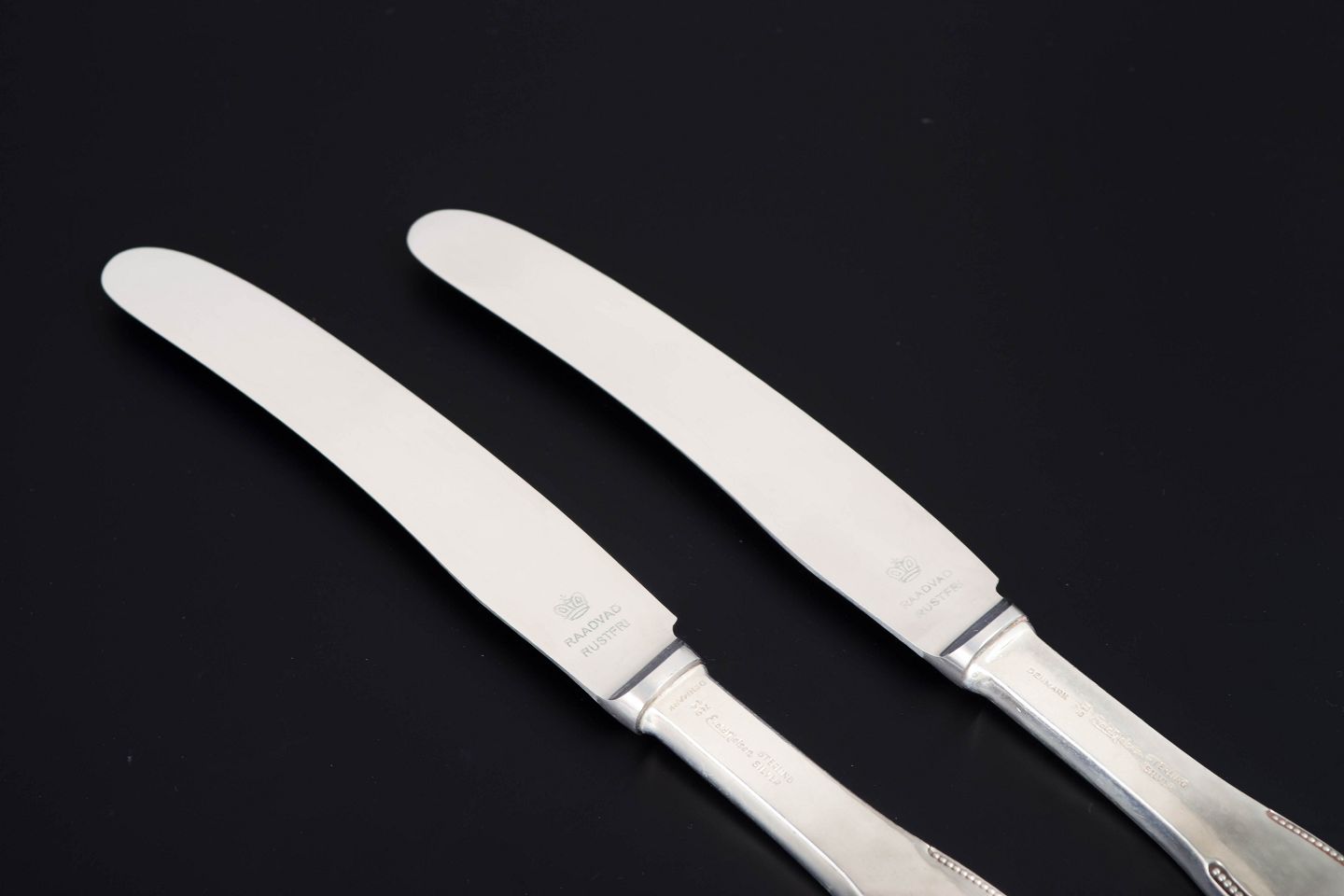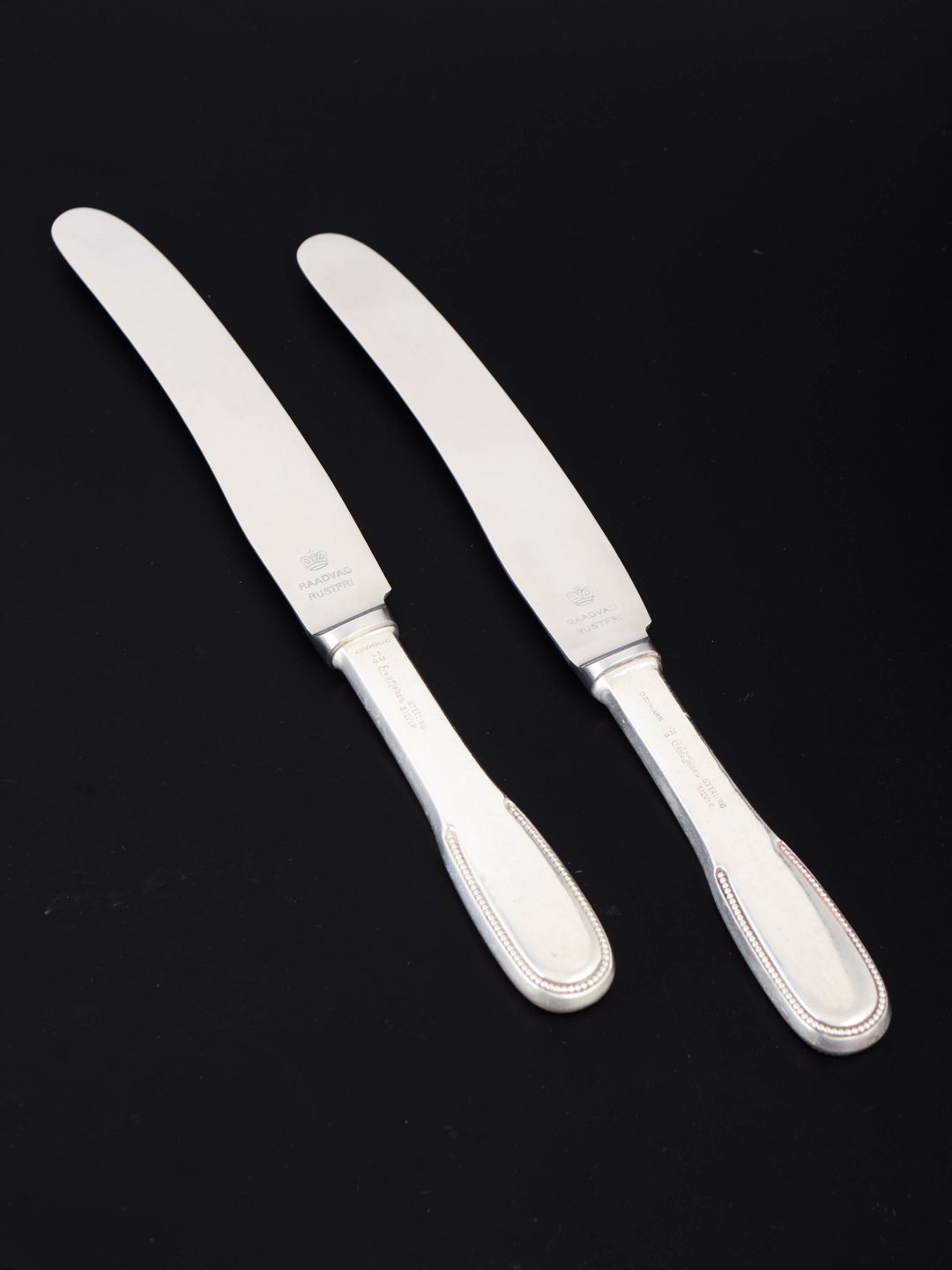 Elegante frokostknive i sterlingsølv og rustfrit stål. Model nummer 14 med klassisk, let afrundet skaftform med diskret perlekant og glat klinge. Fremstillet hos Evald Nielsen.