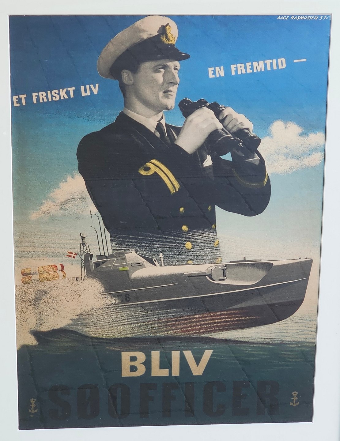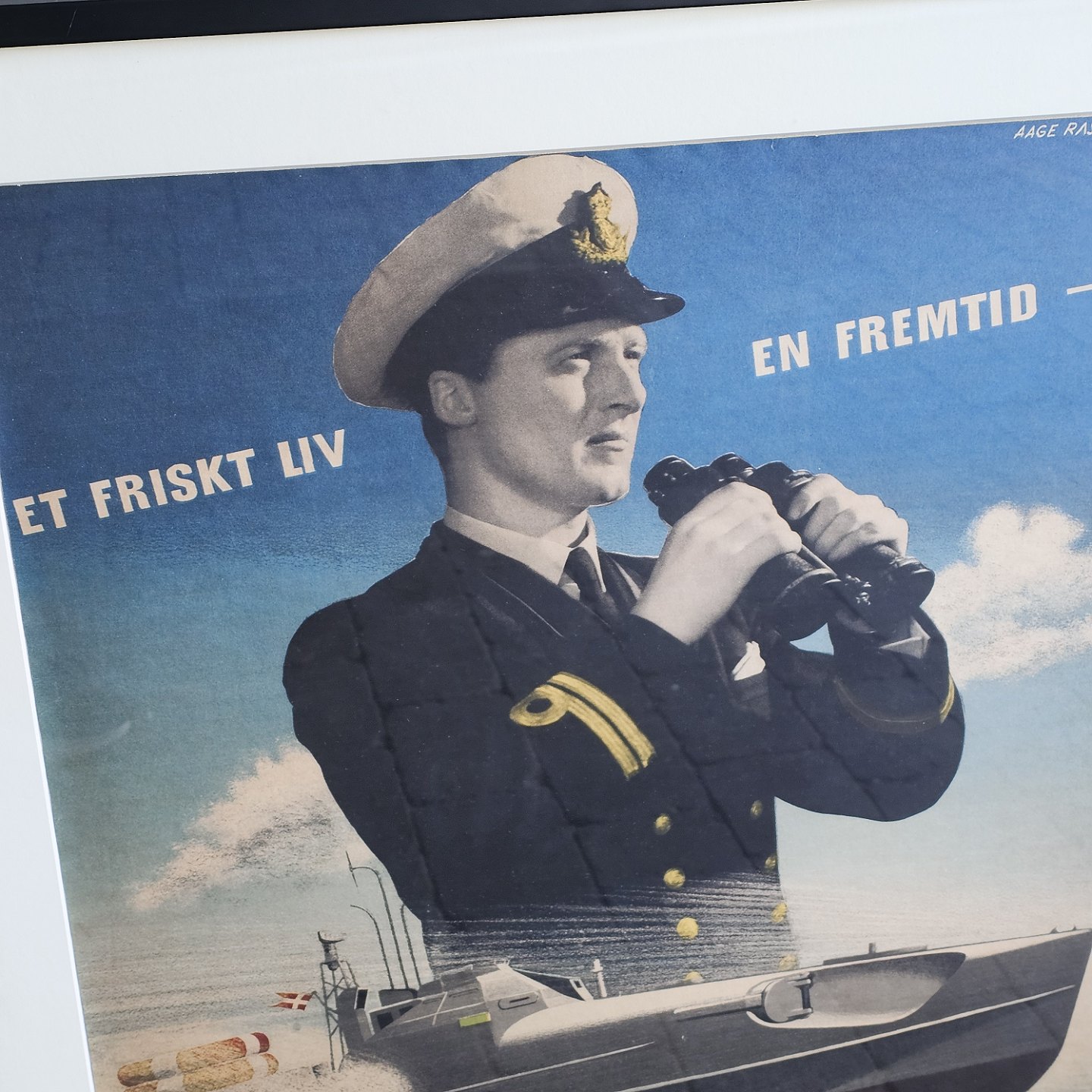 Plakat i ramme med motiv af en søofficer med kikkert og et skib, samt teksten "Et friskt liv - en fremtid. Bliv søofficer"