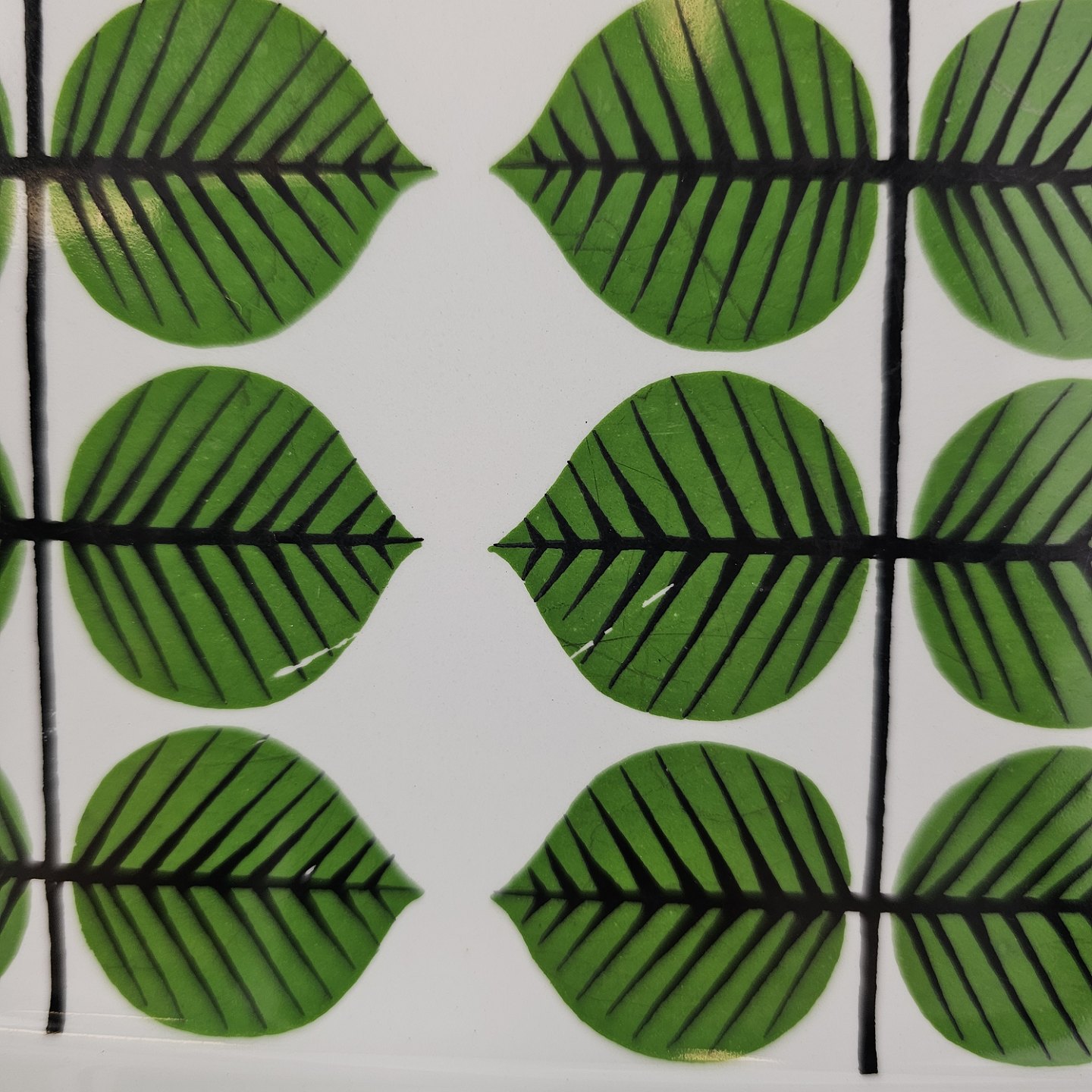 Stel i hvidt porcelæn med dekoration af grønne blade.