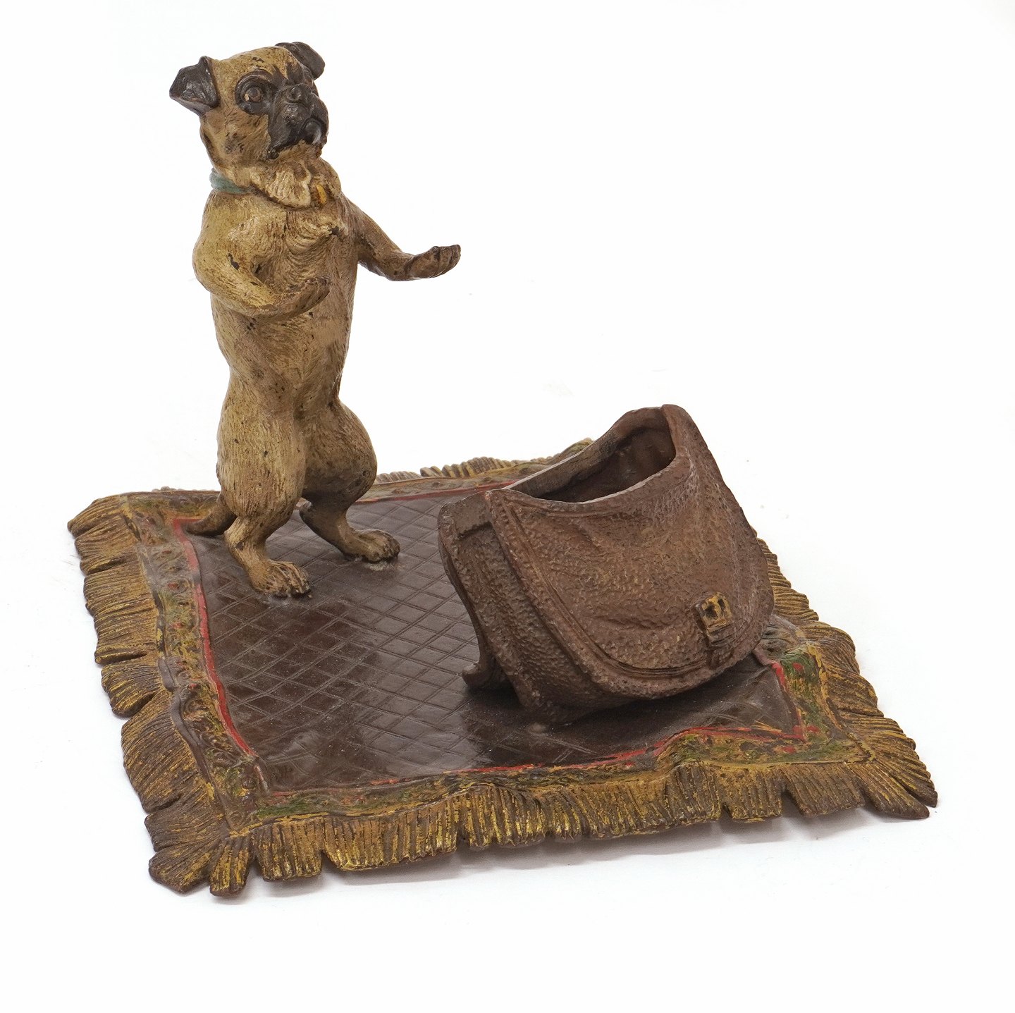 Large Vienna bronze with dog with a bag on a carpet. Marked. H: 12cm. Carpet: 19x15,5cm