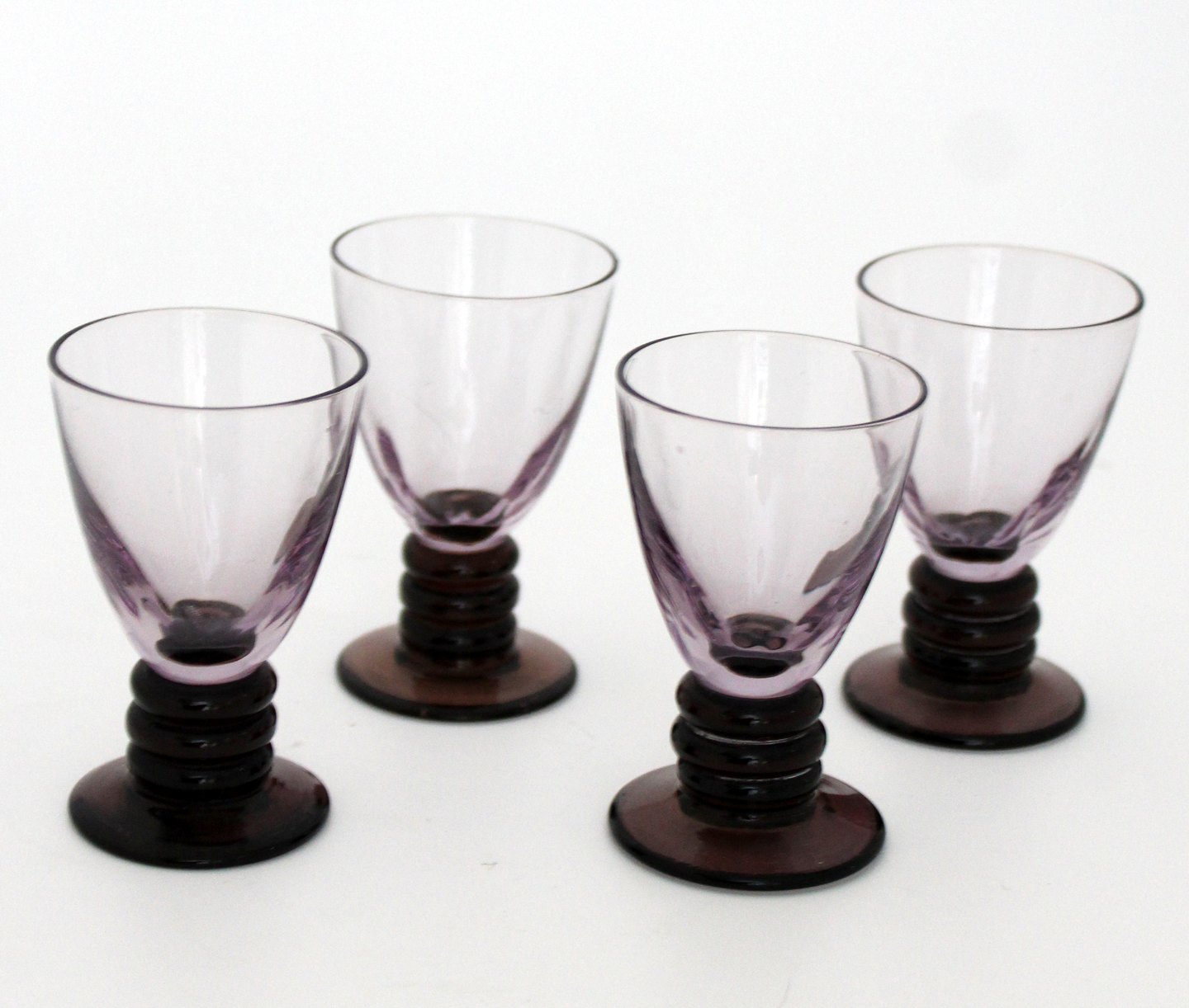 Holmegaard, Aalholm. Snapseglas, optisk stribet lilla kumme og sort fod. Designet af Jacob E Bang. Højde 7 cm. Øverste diameter 4,5 cm. Produktionsfejl på det ene af glassene, se foto. Pris: 250 kr. for sæt på 4 stk.