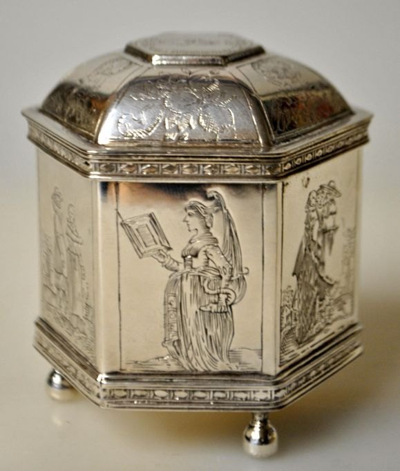 Bryllups æske, kopi af original fra 17. årh. Holland fra Metropolitan Museum of Art, New York, 20. årh. Sekskantet med 1600-tals motiver på alle sider. Låg dekoreret med engle, blomster og håndfæstning. På tre fødder. Messing med sølv. Indvendig lueforgyldt. Stemplet: MMA. H: 7 cm.