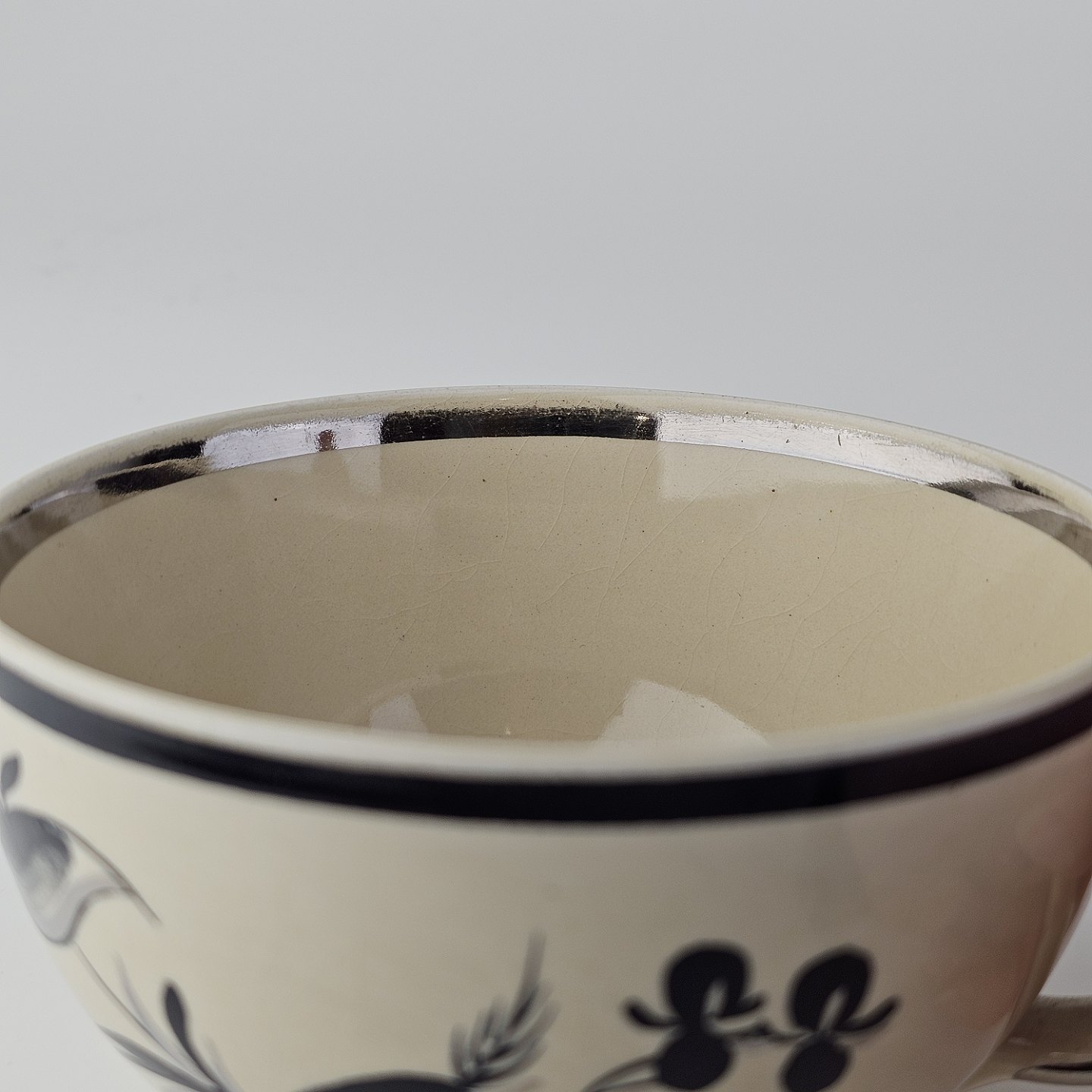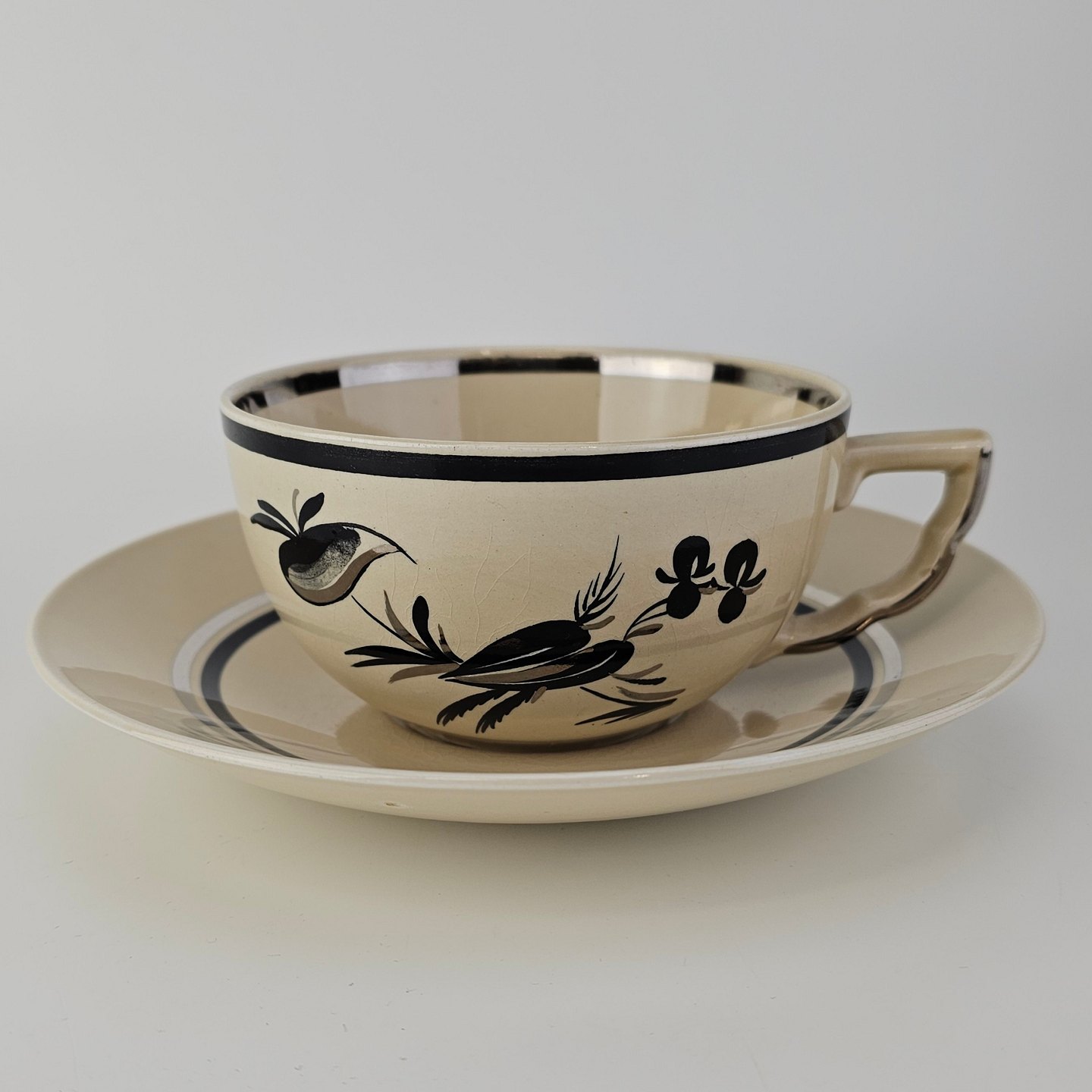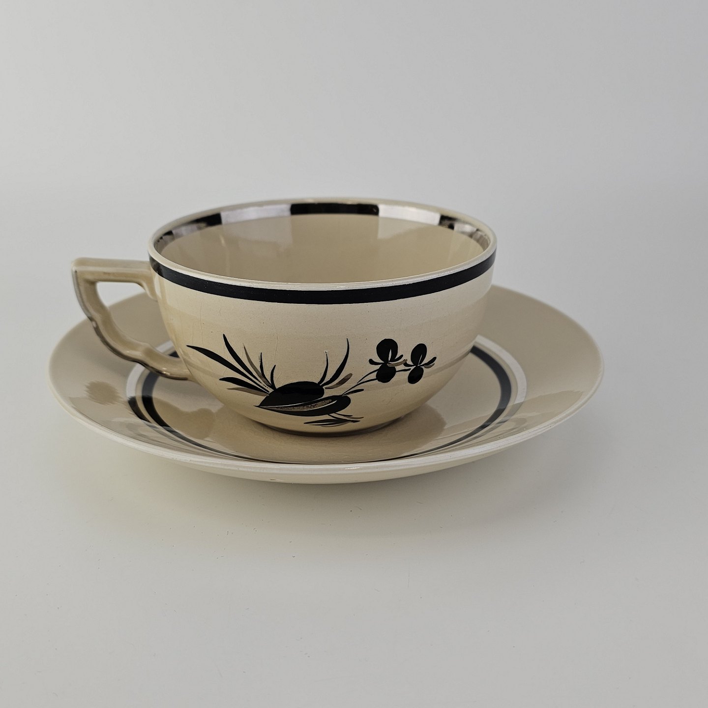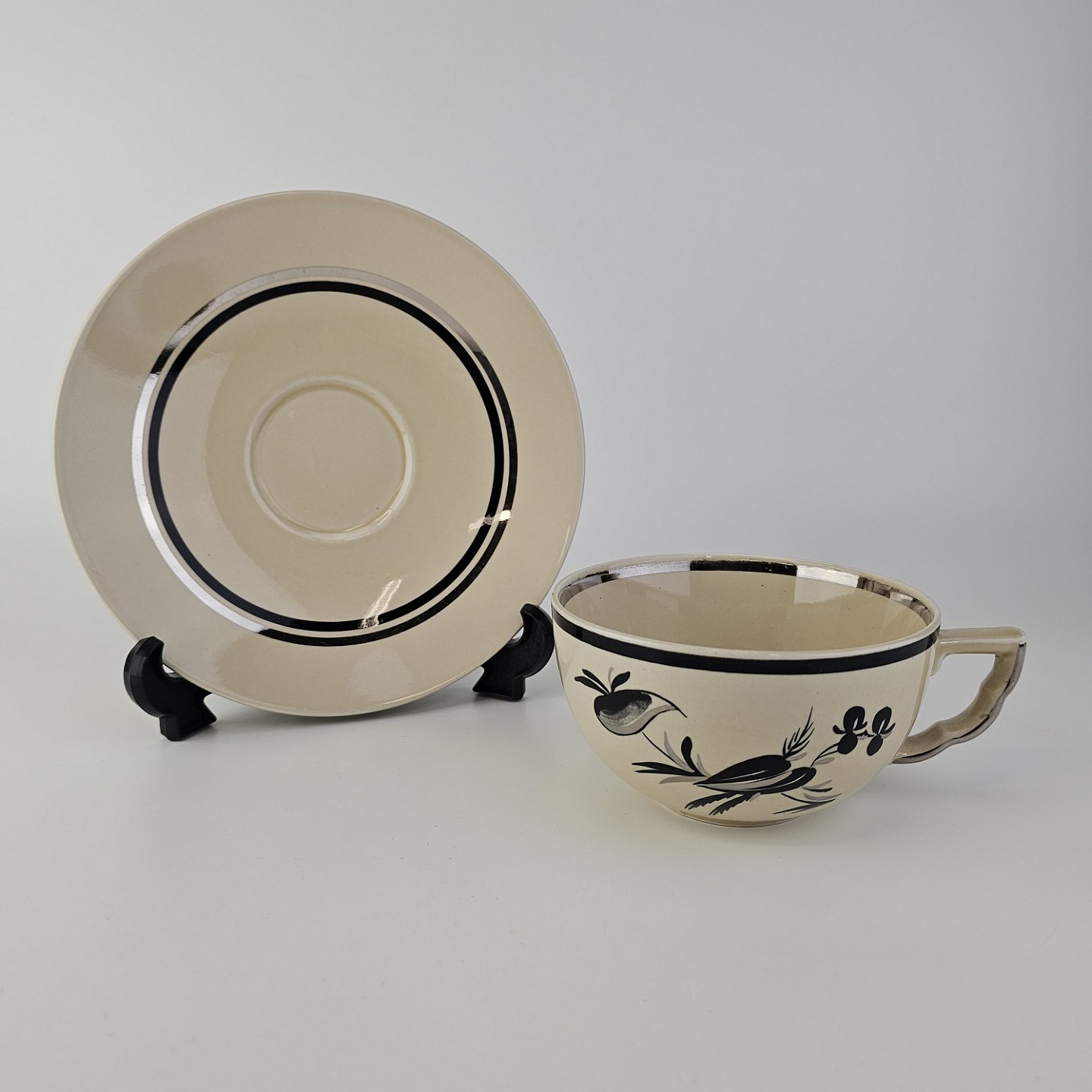 Råhvidt fajancestel i stelform E med dekoration af naturmotiver i sølv og sort farve.