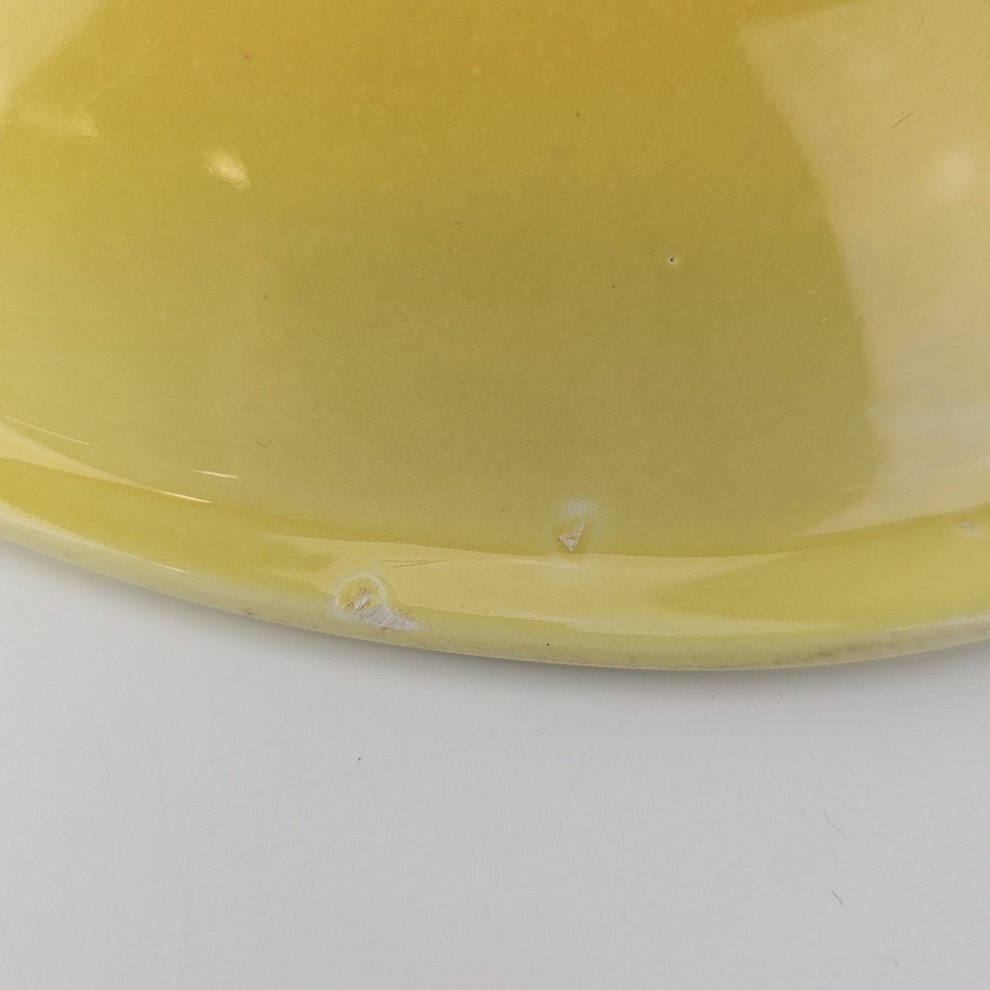 Fajancestel i stelform C med dekoration i gule nuancer med grøn stribe.